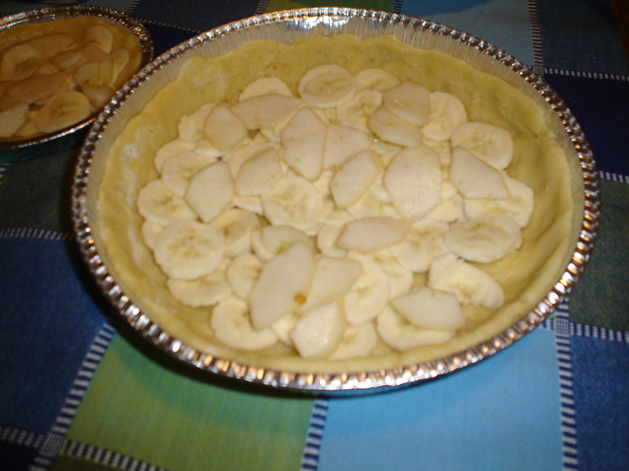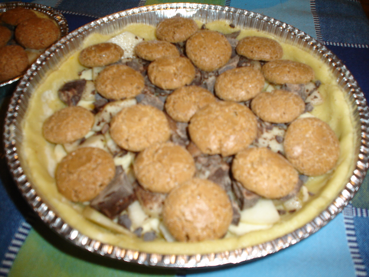 Dopo il riposo stendere i 2/3 dell'impasto e foderare una teglia da 26 cm, coprire il fondo della torta con la banana tagliata a fettine, poi con la pera a fette. Quindi cospargere con il cioccolato sbiciolato grossolanamente e da ultimo porre gli amaretti interi a coprire la superficie. Stendere l'impasto rimasto della frolla coprire la farcia, chiudendo la torta.