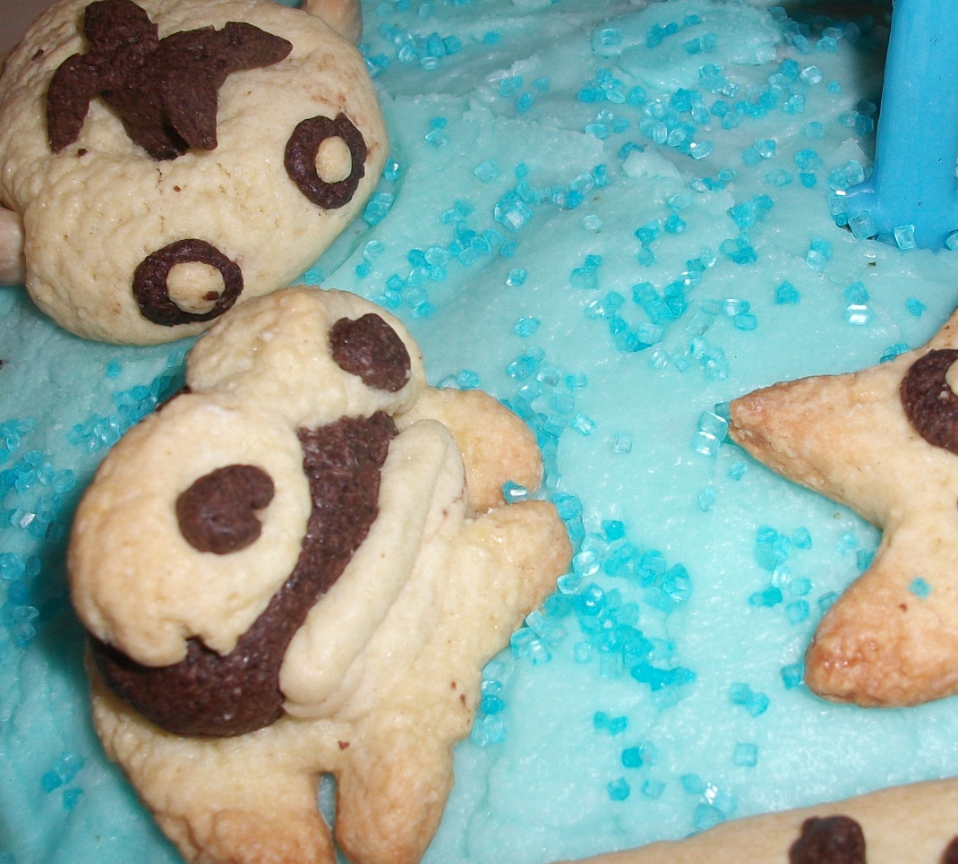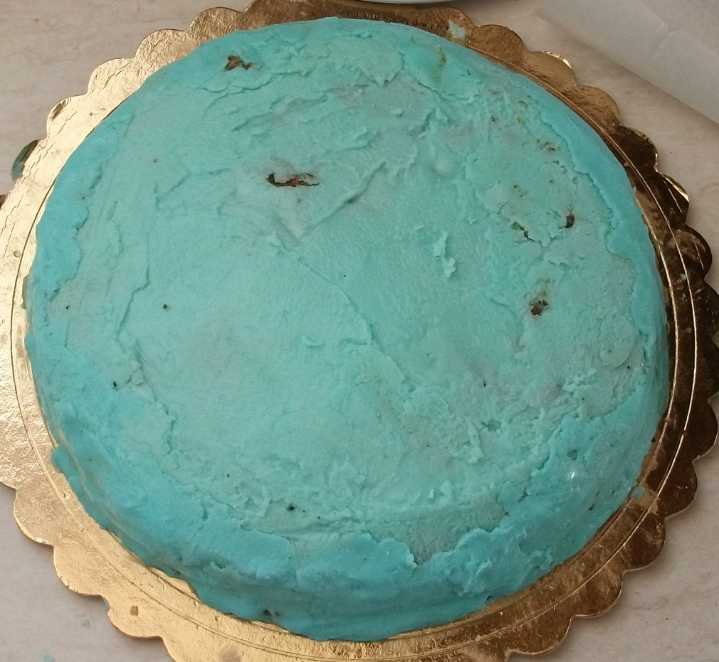 "coperchio chiuso" lo zucchero 15 sec vel turbo. poi aggiungere la panna e il colorante 1-2 min a vel 5.stendere la ghiacchia reale con l'aiuto di una spatola sulla superficie della torta, posizionare poi gli animaletti del mare , la candelina e spolverare di scintille azzurre...