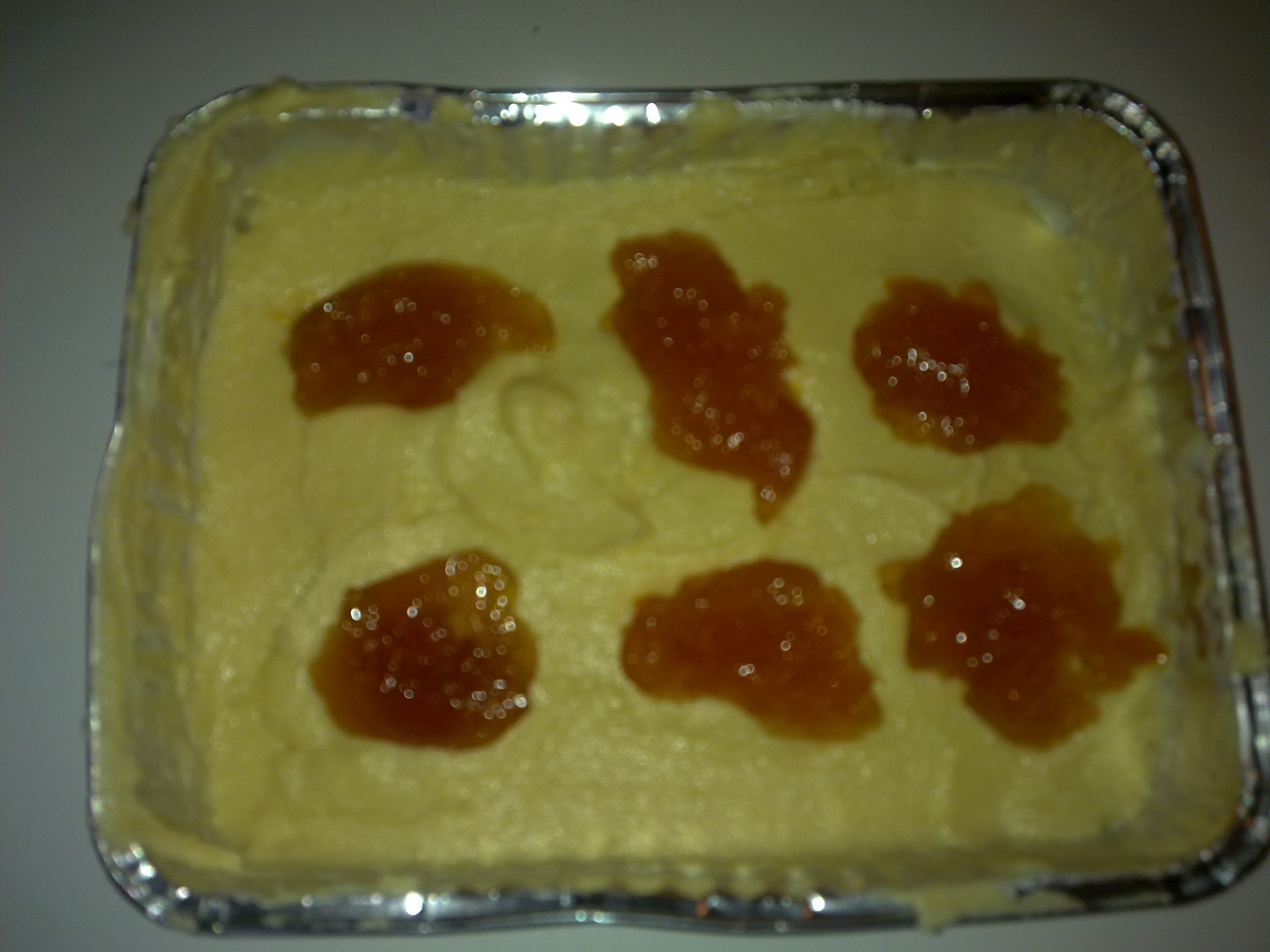 distribuire sull'impasto generose cucchiaiate di marmellata (ho messo quella di pesche, ma l'ho provata con anche con quella di albicocche, fragole e persino con la nutella!!!), durante la cottura sprofonderanno nella pasta.