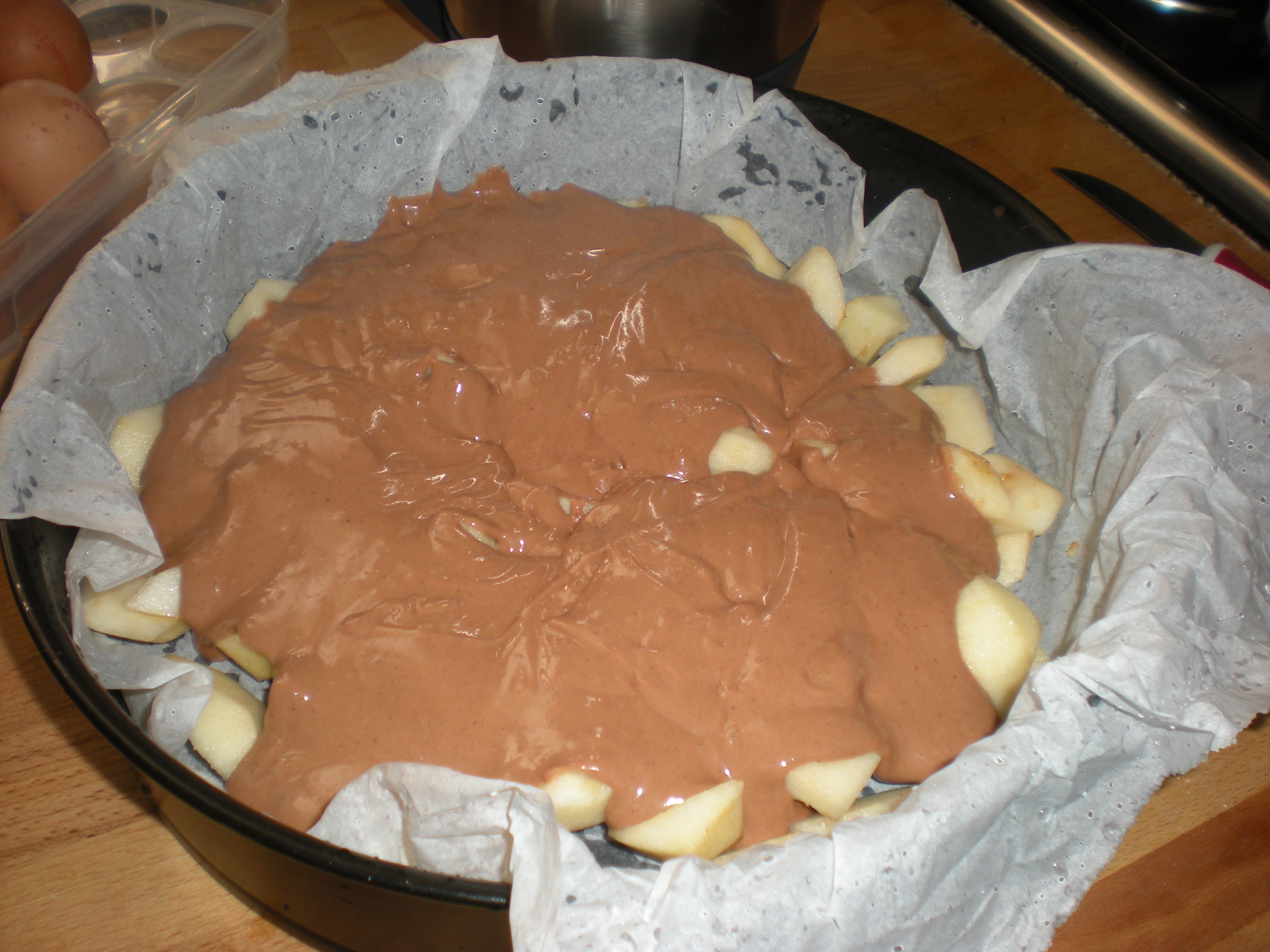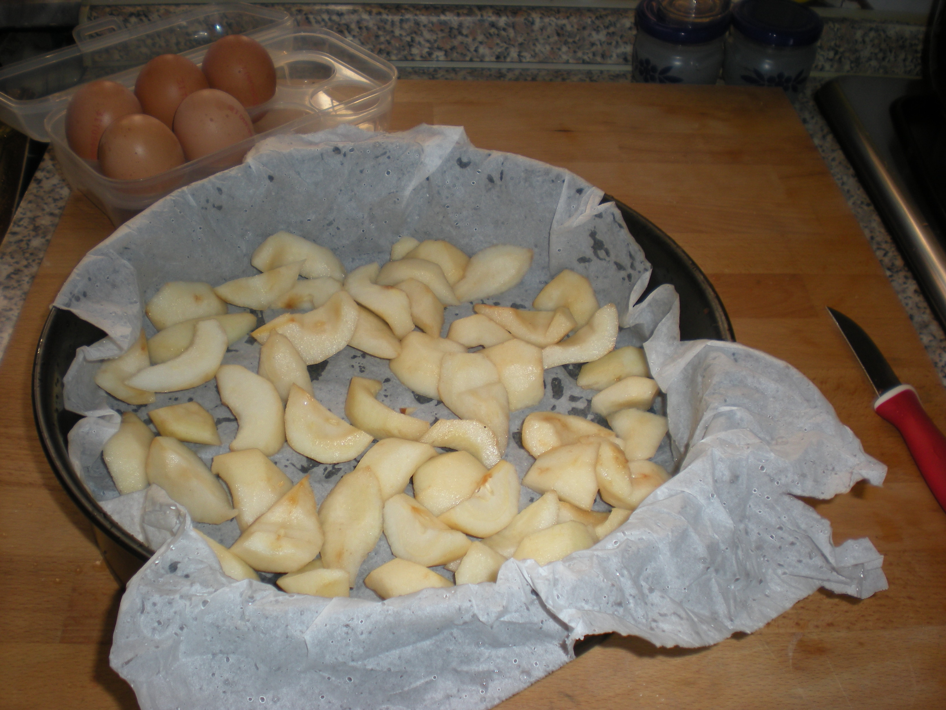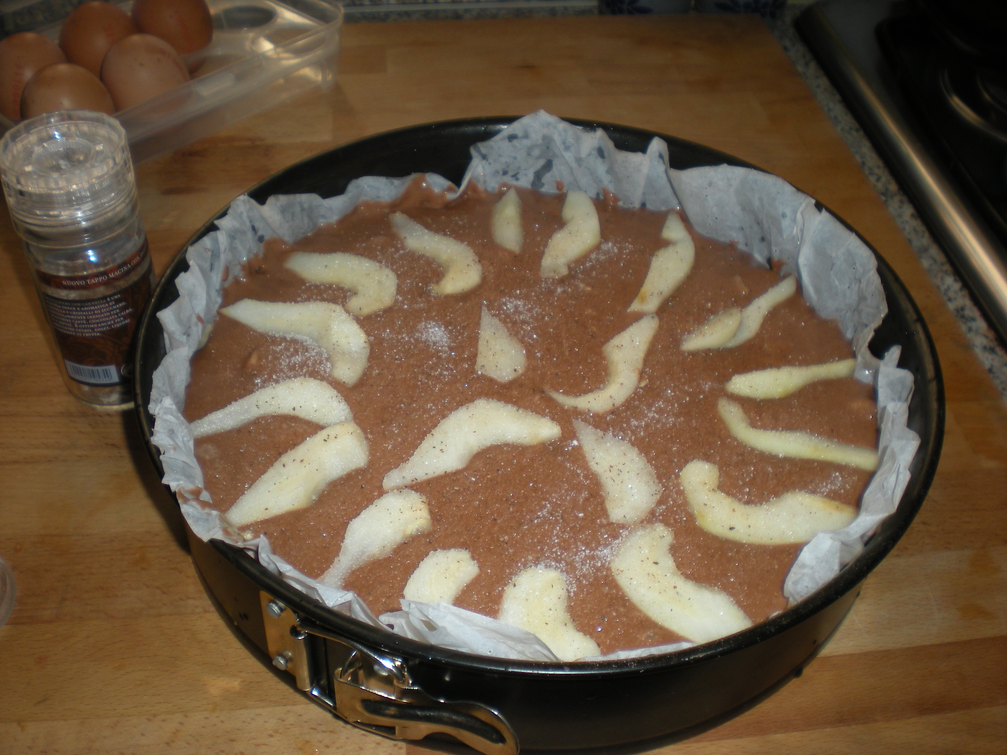 - Preparare la tortiera con carta da forno bagnata e strizzata, mettere sul fondo le pere a tocchetti;