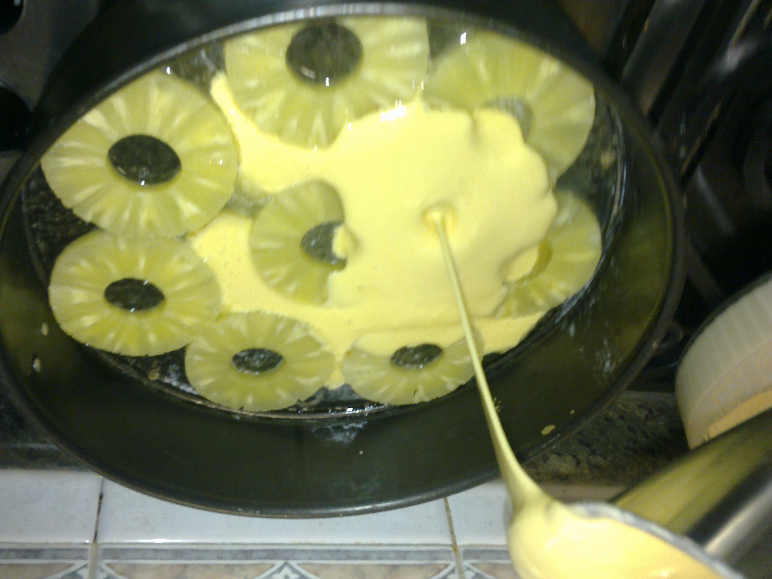 versare il composto nella tortiera, sulle fette di ananas.Cuocere in forno preriscaldato a 180° per 10 min.e a 200°per 30 min.circa.
