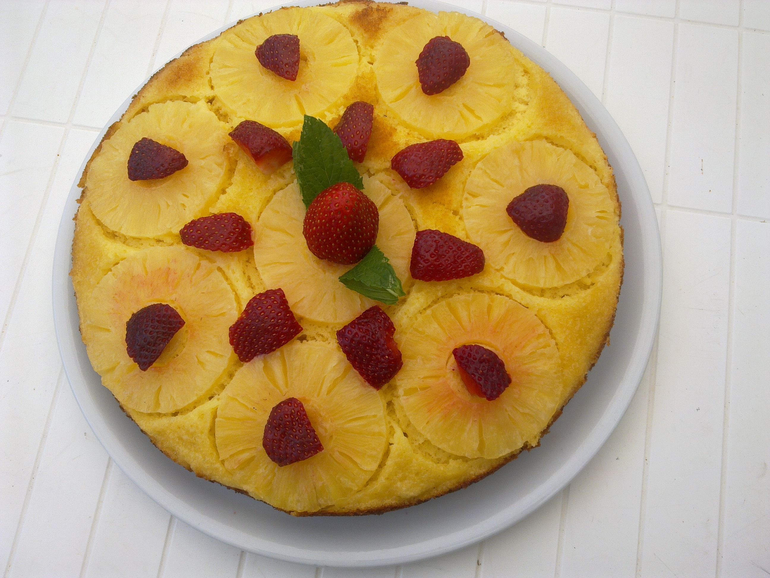 Nonostante ciò la torta è venuta buonissima! L'ho fatta con l'ananas fresca e al posto del mezzo misurino di sciroppo nell'impasto ho messo spremuta di arancia. Da rifare assolutamente con la teglia giusta