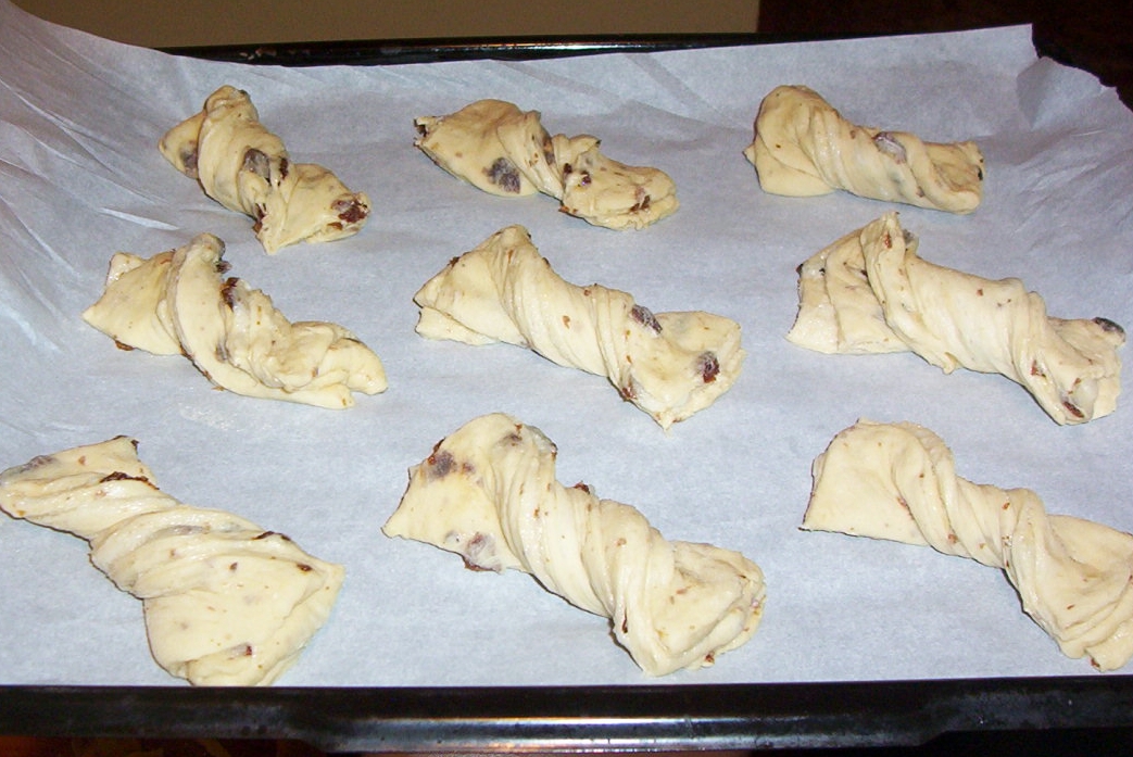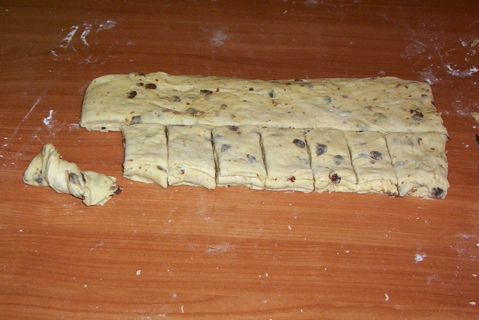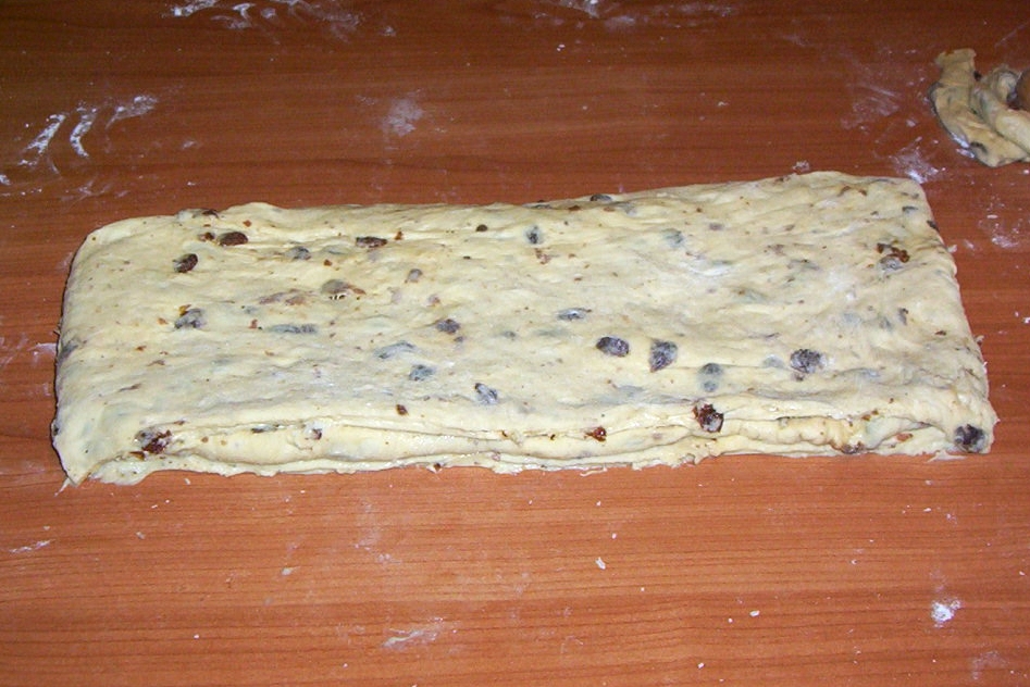 "velocità spiga" .Se risulta troppo liquido aggiungere un pò di farina ma non troppa, deve risultare molto morbido. Trasferire l'impasto in una ciotola infarinata e lasciare lievitare 1 ora al caldo coprendo la ciotola con della pellicola. Una volta lievitato preparare la farcia mettendo il burro e lo zucchero 20 sec. vel. 4. Stendere l'impasto in un rettangolo 48x34, tagliarlo in 3 rettangoli 34x16. Spalmare metà della farcia su di un rettangolo, sovrapporre un altro rettangolo e spalmarci sopra la restante farcia. Finire sovrapponendo l'ultimo rettangolo. Avrete quindi un rettangolo unico con pasta, farcia, pasta,farcia e pasta. Tagliare piccoli rettangoli 8x3 prenderli dalle due estremità e arrotolare formando una piccola treccina. (è più difficile a spiegare che a farli).