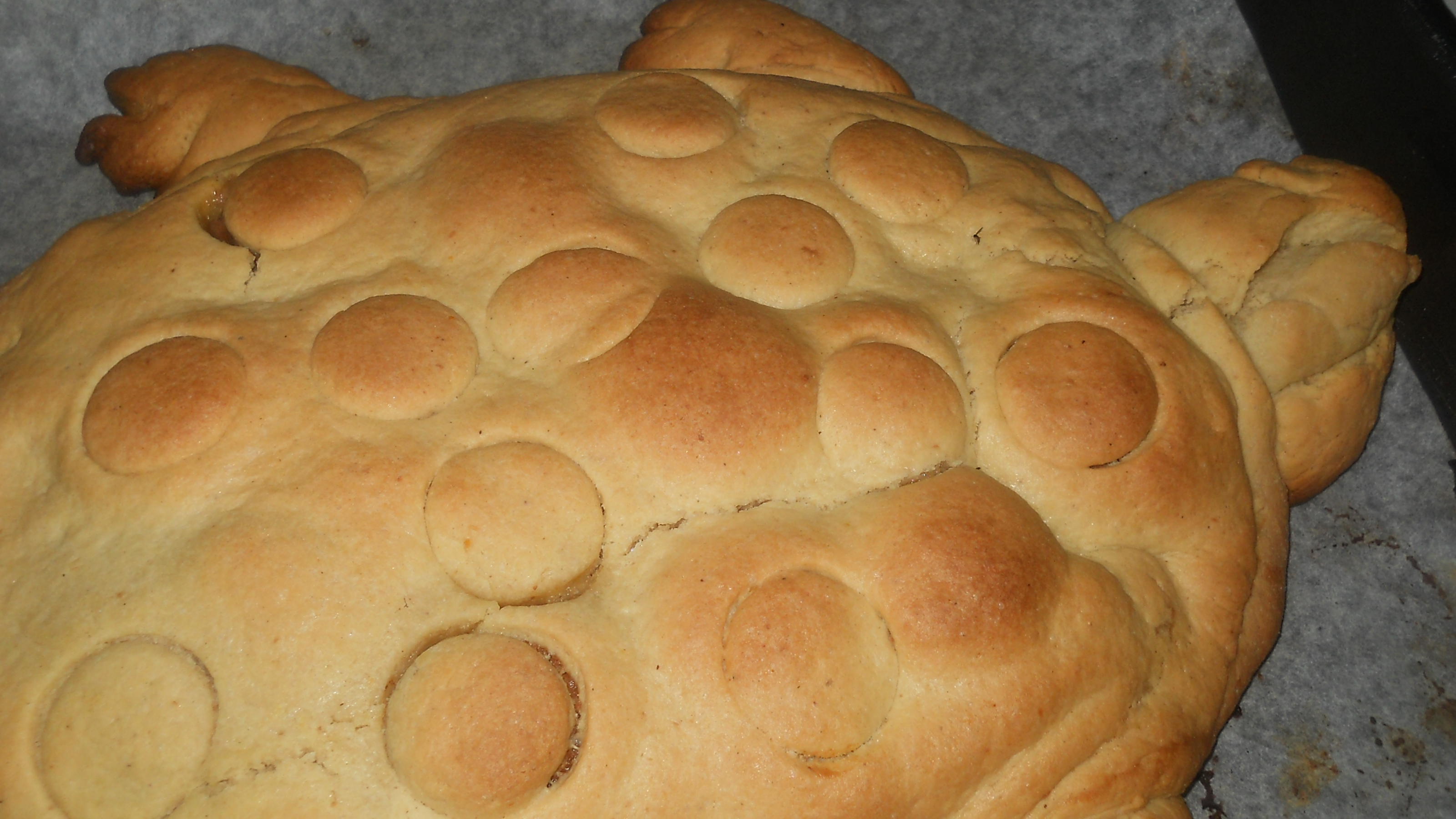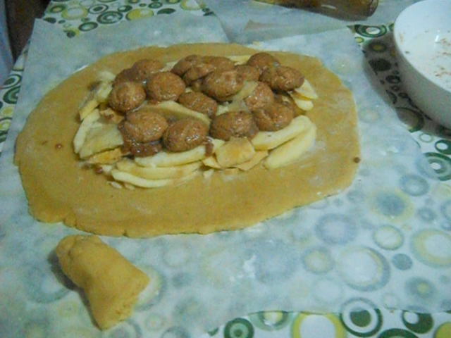 Dividere l'impasto a metà. Stendere una metà con il matterello l'impasto formando un ovale, distribuire le mele a mo' di cupole e coprirle non omogeneamente con gli amaretti bagnati nel latte.