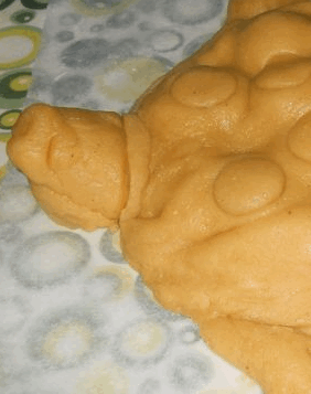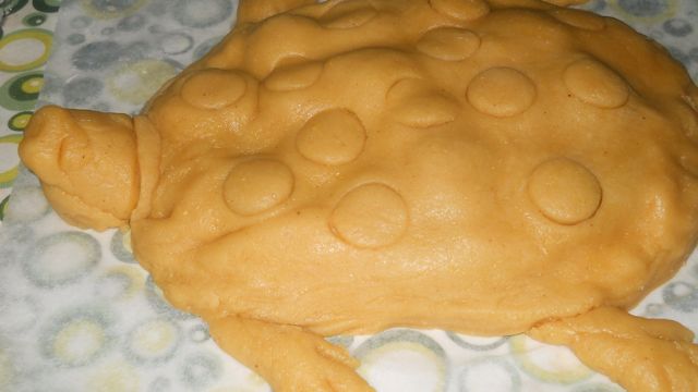 Stendere su carta forno la seconda metà dell'impasto (avendo cura di conservarne una piccola parte da utilizzare per formare la testa e le zampette della tartaruga) e coprire l'impasto che contiene gli amaretti e le mele. Eliminare con un coltello eventuali sbavature e modellare la testolina e le zampette.