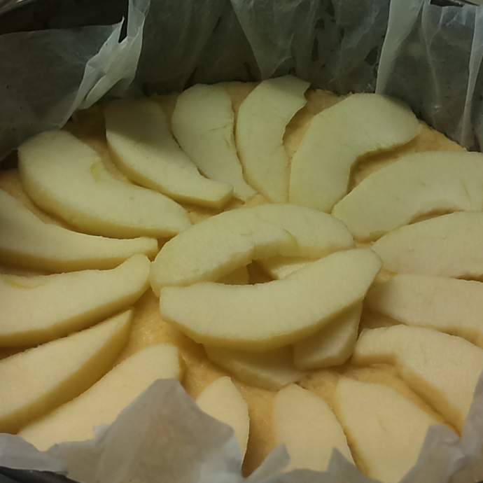 Nel boccale mettere burro ammorbidito, farina e maizena e amalgamare per 20 sec., vel. 6; aggiungere sale, zucchero e l'uovo e impastare per 10 sec., vel. 5. Stendere l'impasto in una tortiera (24 cm) imburrata o foderata di cartaforno, aiutandovi con le mani appena inumidite o con la spatola (non è un impasto liquido, ma nemmeno così sodo da potere essere steso e sposato, perciò appoggiatelo nella tortiera e poi con la spatola o con le mani umide livellatelo pian piano portandolo verso i bordi con movimenti circolari). Affettate le mele (fettine di circa mezzo cm) ed adagiate le fette sull'impasto (a me sono risultati due strati di mela); infornate in forno già caldo a 200° per 20 minuti.