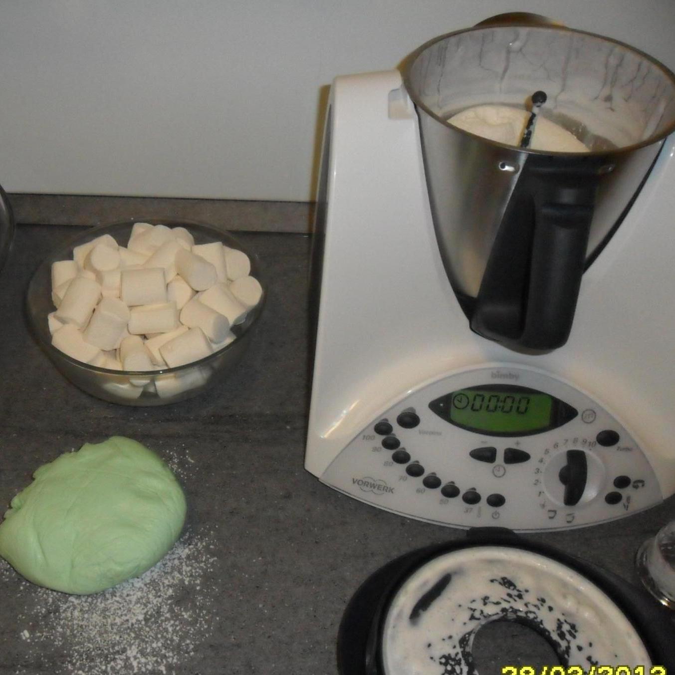 Metti nel boccale le i marshmellow tagliati a pezzetti, aggiungi l'acqua e fai fondere per 6 minuti a 80° velocità 1 (se non è del tutto sciolto continua per qualche secondo). Dopo che il composto sarà sciolto aggiungi metà dello zucchero e imposta 10 secondi velocità 7. Versa l'impasto sul restante zucchero a velo adagiato su carta forno, impasta con le mani unte lievemente di burro. Colorate la pasta con i coloranti e conservare per 24 ore coperta con pellicola e chiusa in un contenitore ermetico.