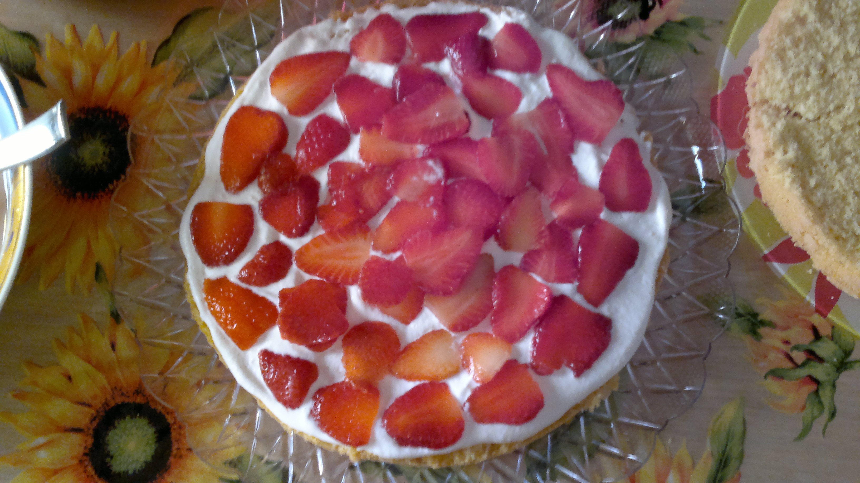 Per preparare la bagna io ho utilizzato i fornelli (il Bimby era già a lavoro con il Pan di Spagna!): riascaldare l'acqua con lo zucchero e il liquore; far raffreddare e tenere da parte. Pulire le fragole e lavarle; tagliarle a fettine non troppo sottili o se si preferisce anche a tocchettini; condirle come si fa abitualmente con zucchero e succo di limone ( su 500g di fragole ho messo 2 cucchiai di zucchero e il succo di un limone ). Tenere da parte ad insaporire. Volendo le fragole si possono condire anche il giorno prima.Montare la panna e tenerla in frigo fino al momento di utilizzarla. A questo punto bagnare il Pan di Spagna con la bagna a cui avremo aggiunto il sughino delle fragole; fare il primo strato con la panna e con la fragole messe a raggiera, ricoprire con il secondo disco di Pan di spagna, bagnare e di nuovo panna e fragole; chiudere con il terzo disco, anch'esso bagnato e ricoprire tutta la torta con un sottile strato di panna. Ultimare la torta con la pdz e guarnire con ciuffetti di panna.