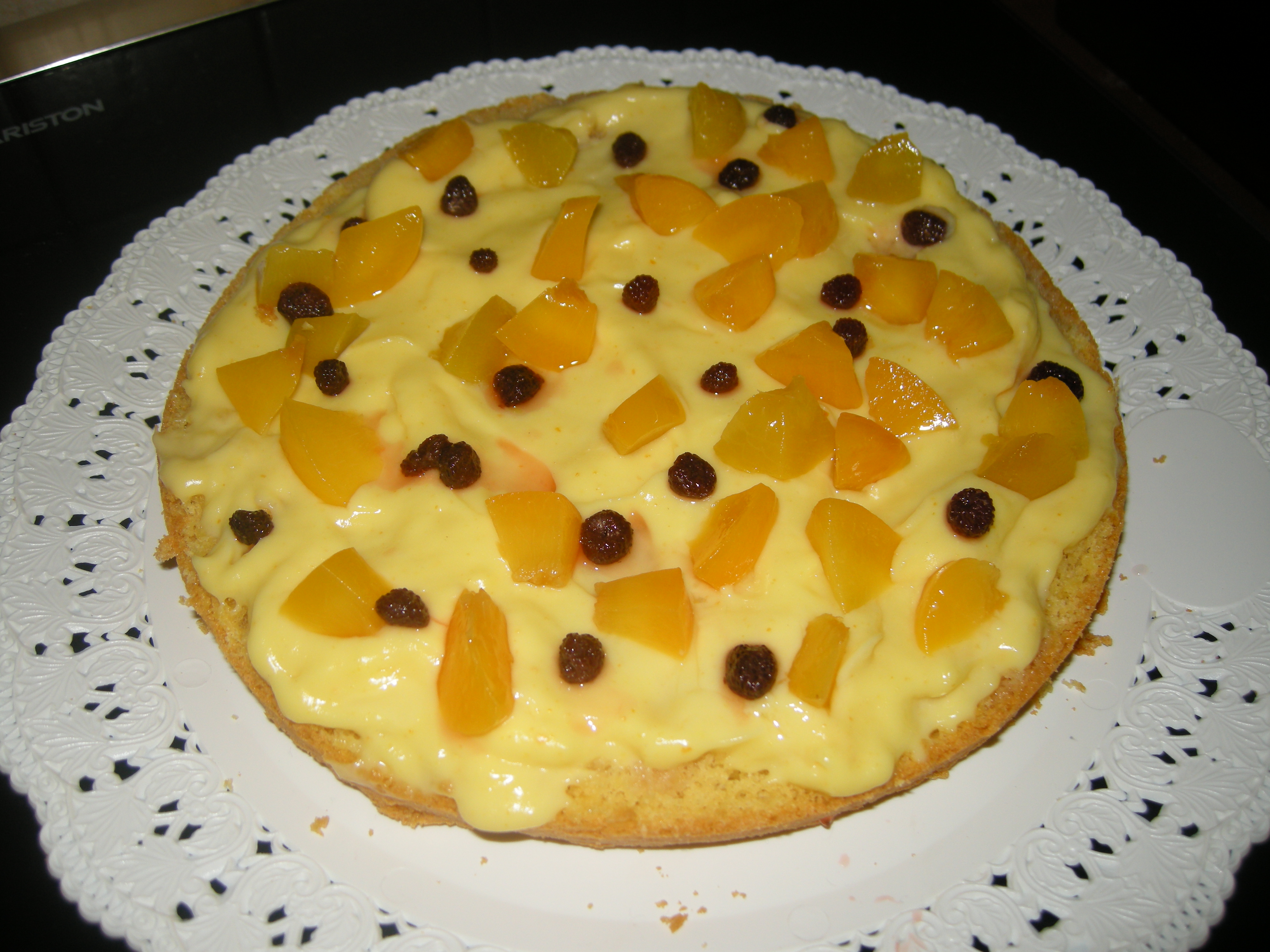Lasciare raffreddare e tagliare tre dischi da inzuppare con la bagna ottenuta versando in una ciotola lo sciroppo delle pesche, il succo di ananas, il fragolino e lo zucchero.