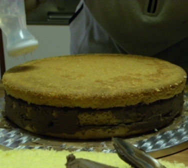 Preparare il giorno prima un pan di spagna rotondo diametro 26, 2 impasti di pan di spagna nella teglia da 39x33 (io ho usato quelle di alluminio della c.......ki, prolungando la cottura di circa 15 min). Sempre il giorno prima, preparare la ganche facendo scaldare la panna per 2 minuti a 90° Vel.