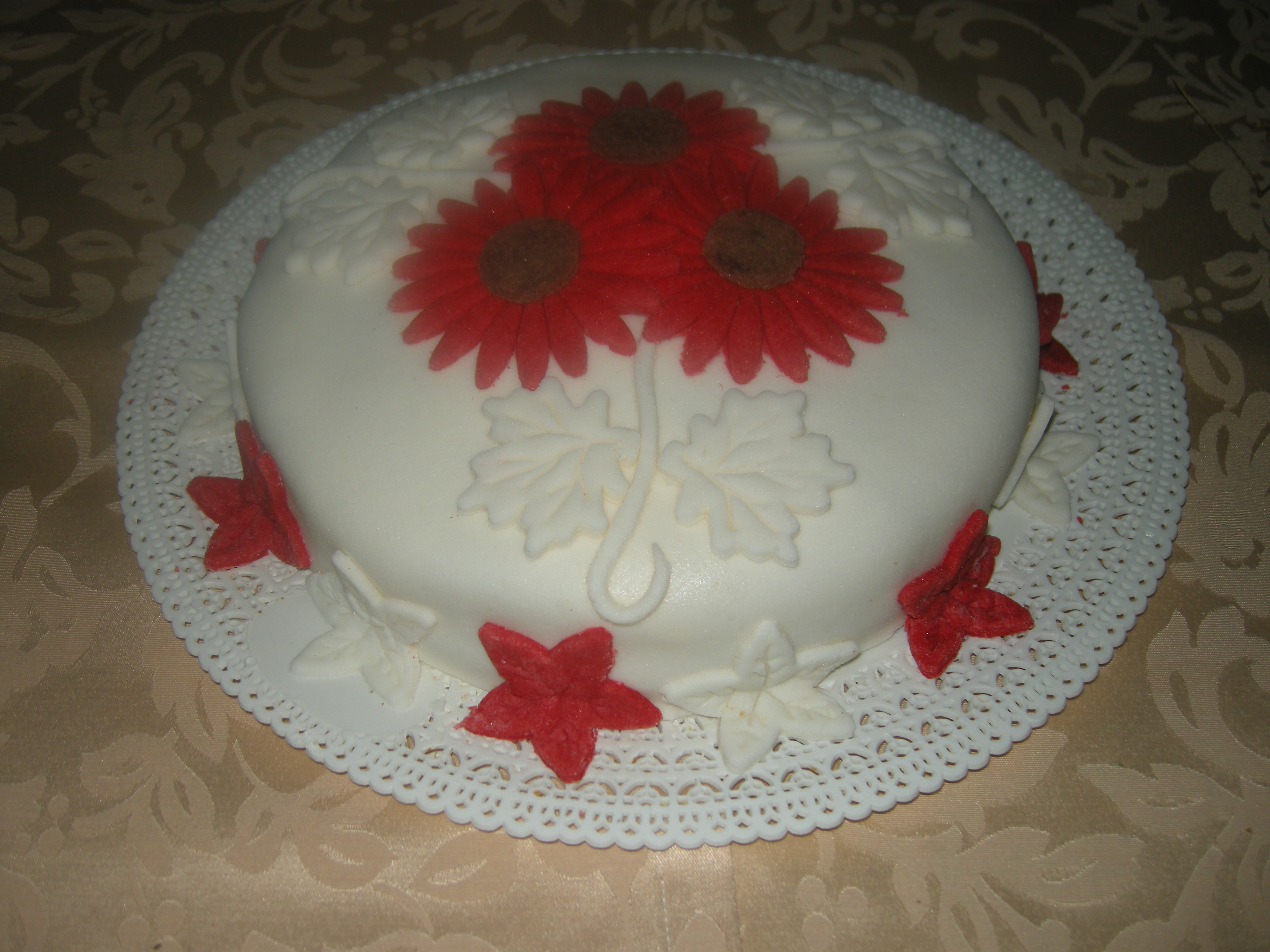 Il PDS è stato tagliato in 2 dischi ,inzuppati con la bagna alla fragola e rum e farciti ognuno con uno strato di marmellata sovrapposto da uno di crema al cioccolato bianco.La torta è stata poi decorata con della pasta di zucchero di Giuliana..