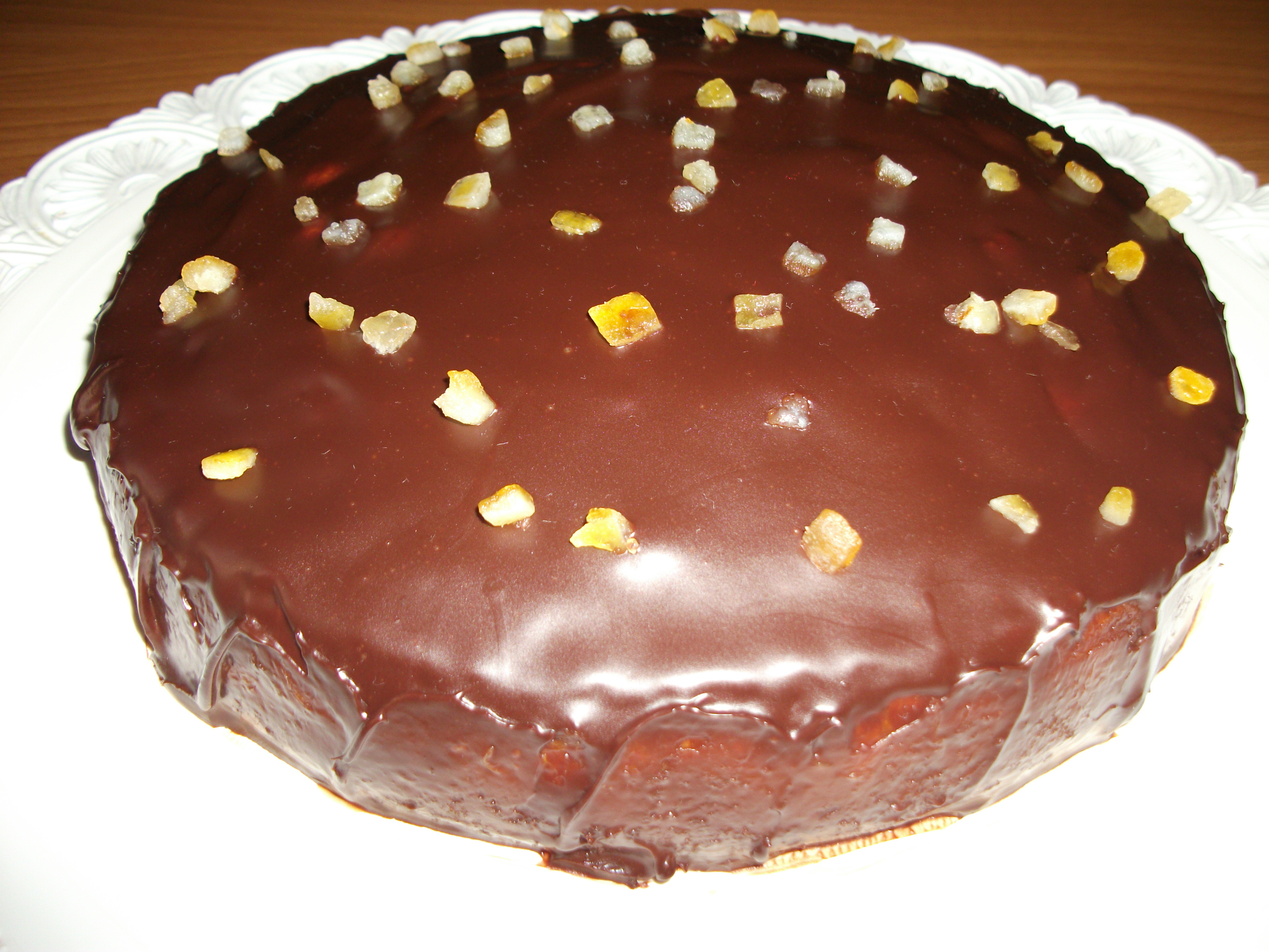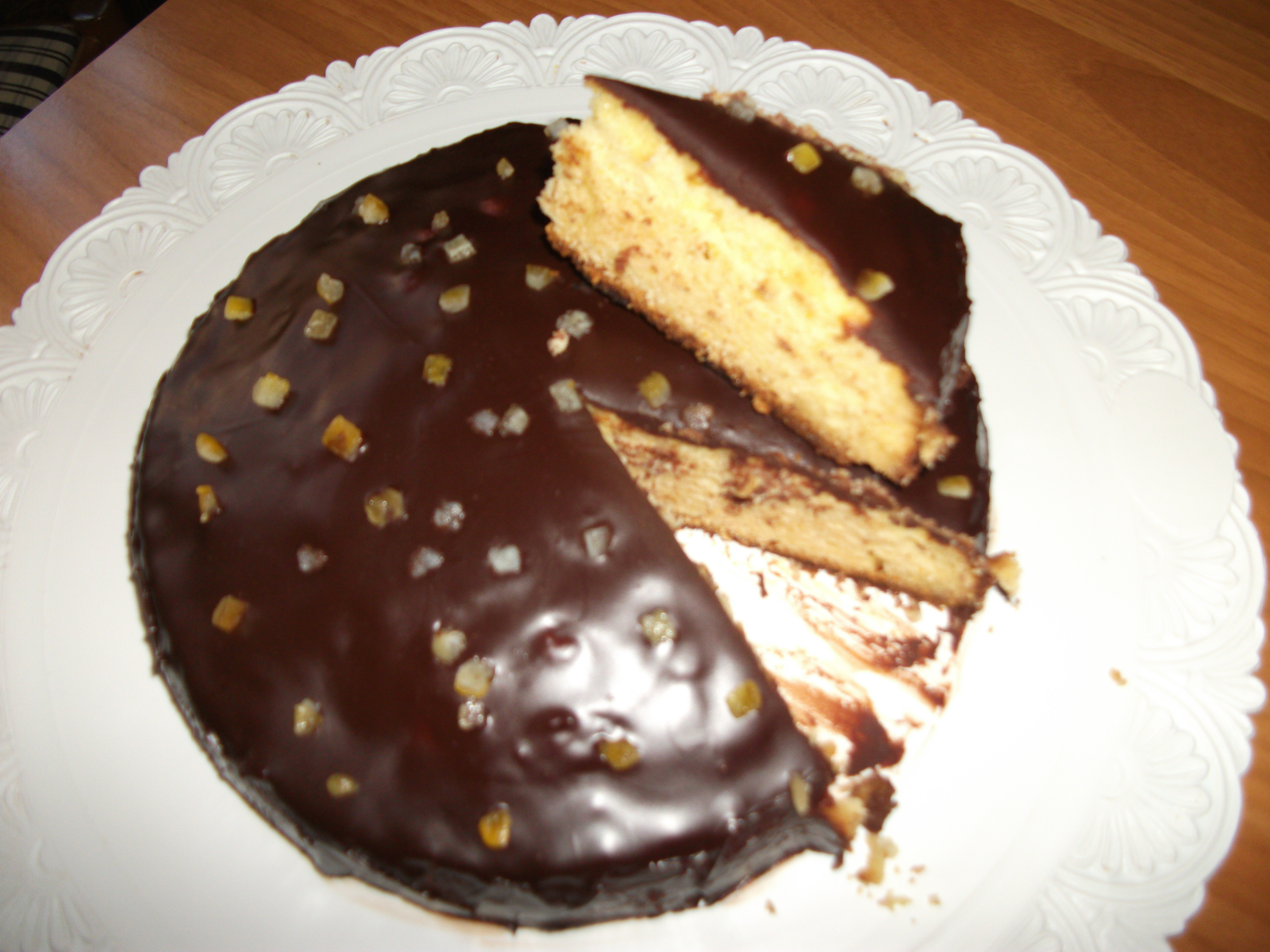 "coperchio chiuso" il cioccolato spezzettato e la panna cuocere per 10 min 50° vel 1. Ricoprire la torta e guarnire con la scorza d'arancia candita o fettine di arancia caramellate.P.s Questa torta va preparata il giorno prim. Va insuppata derettamente nello stampo e fare molta attenzione quando si trasferisce nel piatto da portata !