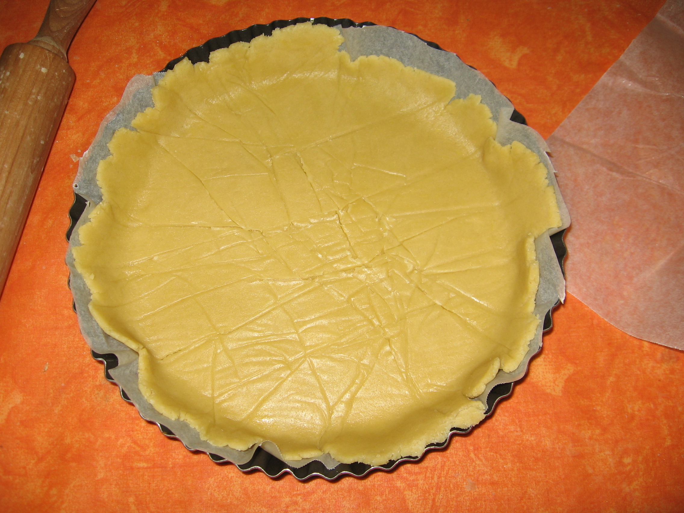 - Stendere il pezzo più grande in modo che anche i bordi della tortiera siano coperti dalla pasta ed adagiarla nella tortiera con la carta forno;