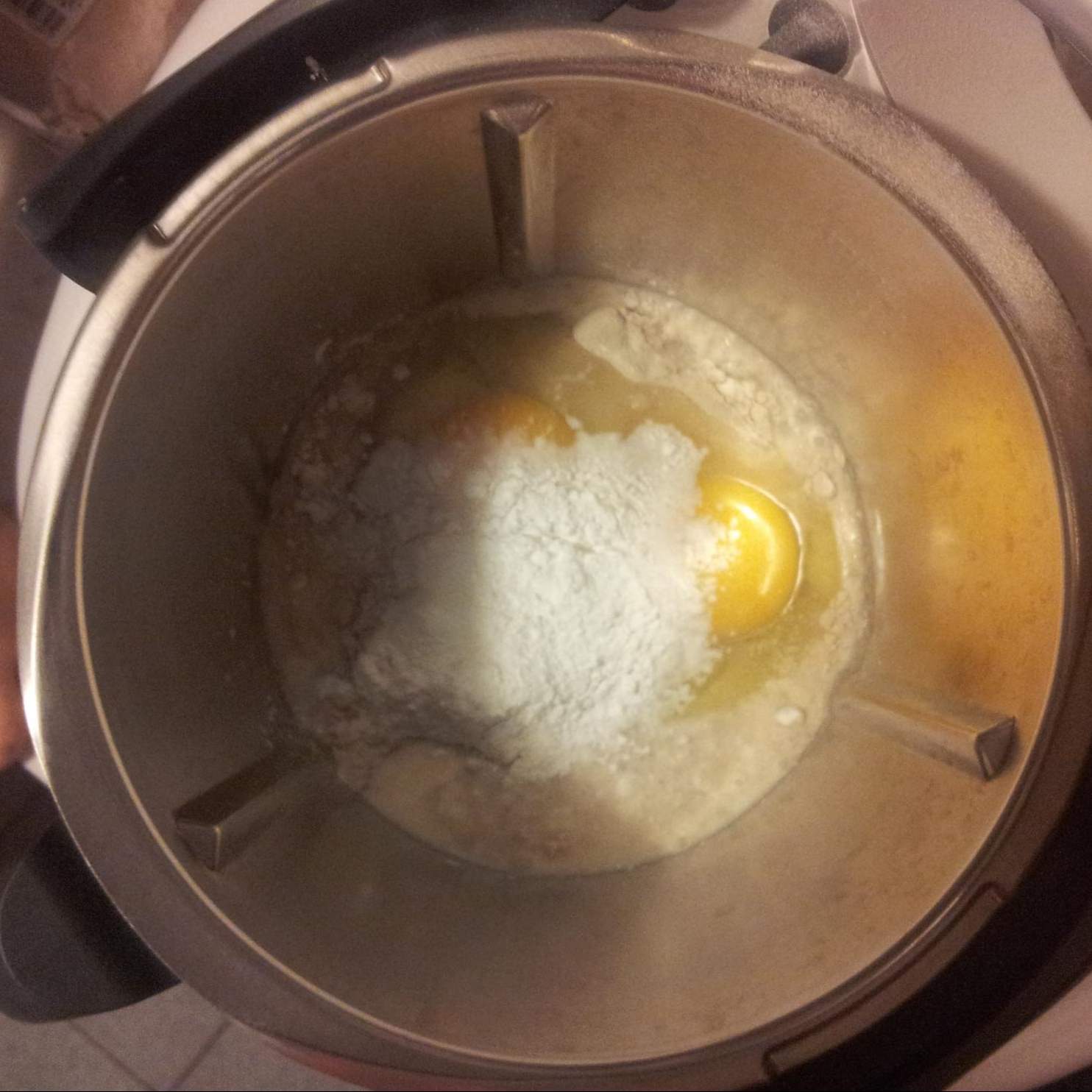 2. 2. Mettere nel coperchio chiuso"coperchio chiuso" le farine, il lievito, il latte, lo zucchero, le uova e malgamare gli ingredienti per 30 sec vel 4.