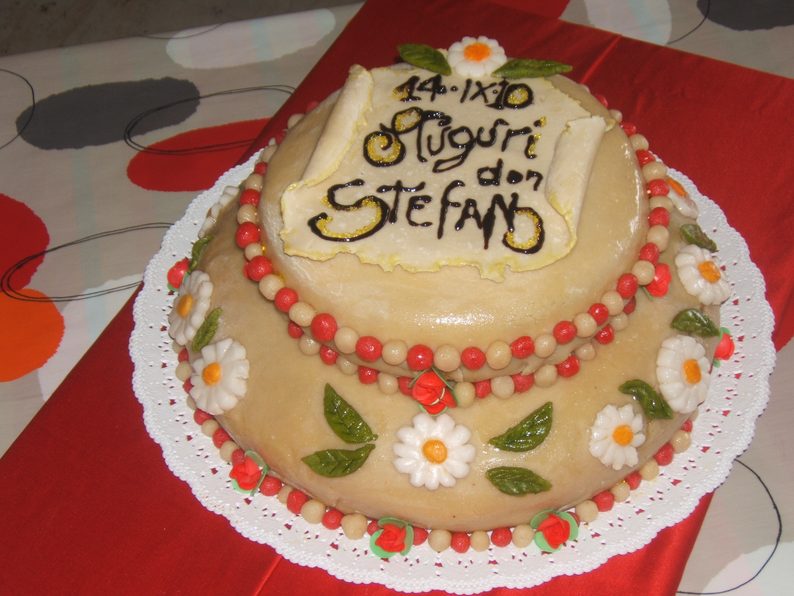 Una volta preparato due pan di spagna (40 e 28 cm di diametro), li ho farciti con la crema pasticciera, a cui ho aggiunto le amarene. Ho diviso in due panetti la pasta di mandorle e ne ho tratto 2 sfoglie, una più piccola e una più grande con cui ho ricoperto le due torte spennellate con un po' di crema per far aderire bene la sfoglia. Ho inserito nella torta più grande 4 bastoncini delle stesse dimensioni della torta grande a sostegno del "secondo piano". Ho appoggiato la torta più piccola sui bastoncini e ho decorato con una pergamena e palline rosse e bianche di pasta di mandorle e con fiorellini e foglioline di pan di zucchero.