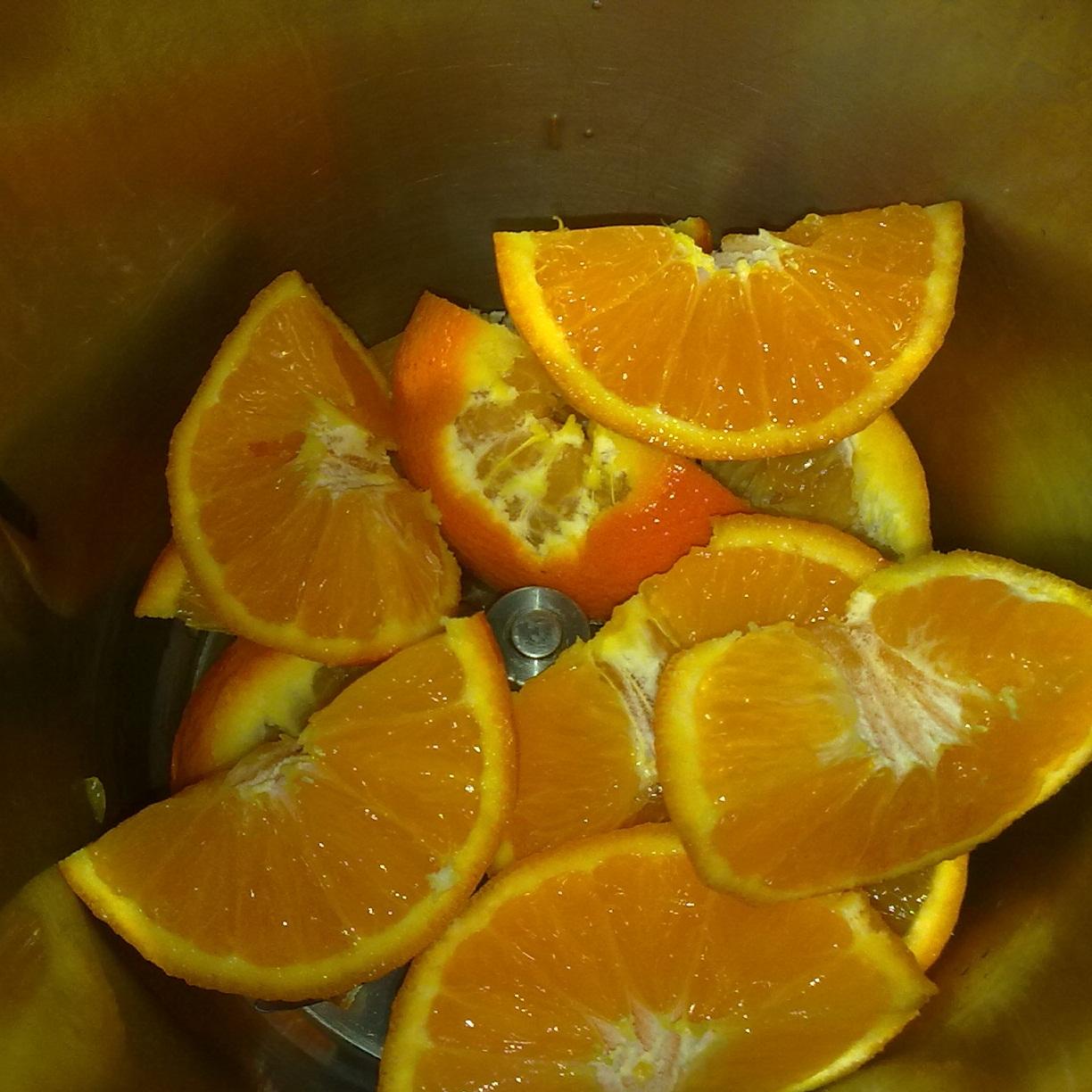Togliere la parte superiore ed inferiore della buccia delle clementine, tagliatele in quattro parti, mettetele nel con tutta la buccia e frullare 20 sec. vel.8.unire il resto degli ingredienti 3 min. vel 3/4