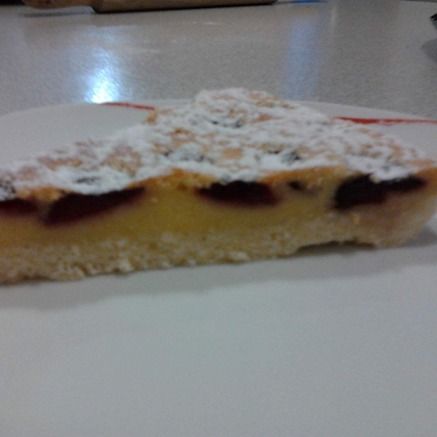 Nel frattempo snocciolare le ciliegie e metterle da parte.Prendere l'impasto dal frigo e stenderlo tra 2 fogli di carta forno e sistemarlo in una teglia per crostate.Versarvi il ripieno e affondarvi le ciliegie.Infornare a 180°per 40-45 min.circa.Quando è fredda polverizzare con dello zucchero a velo.
