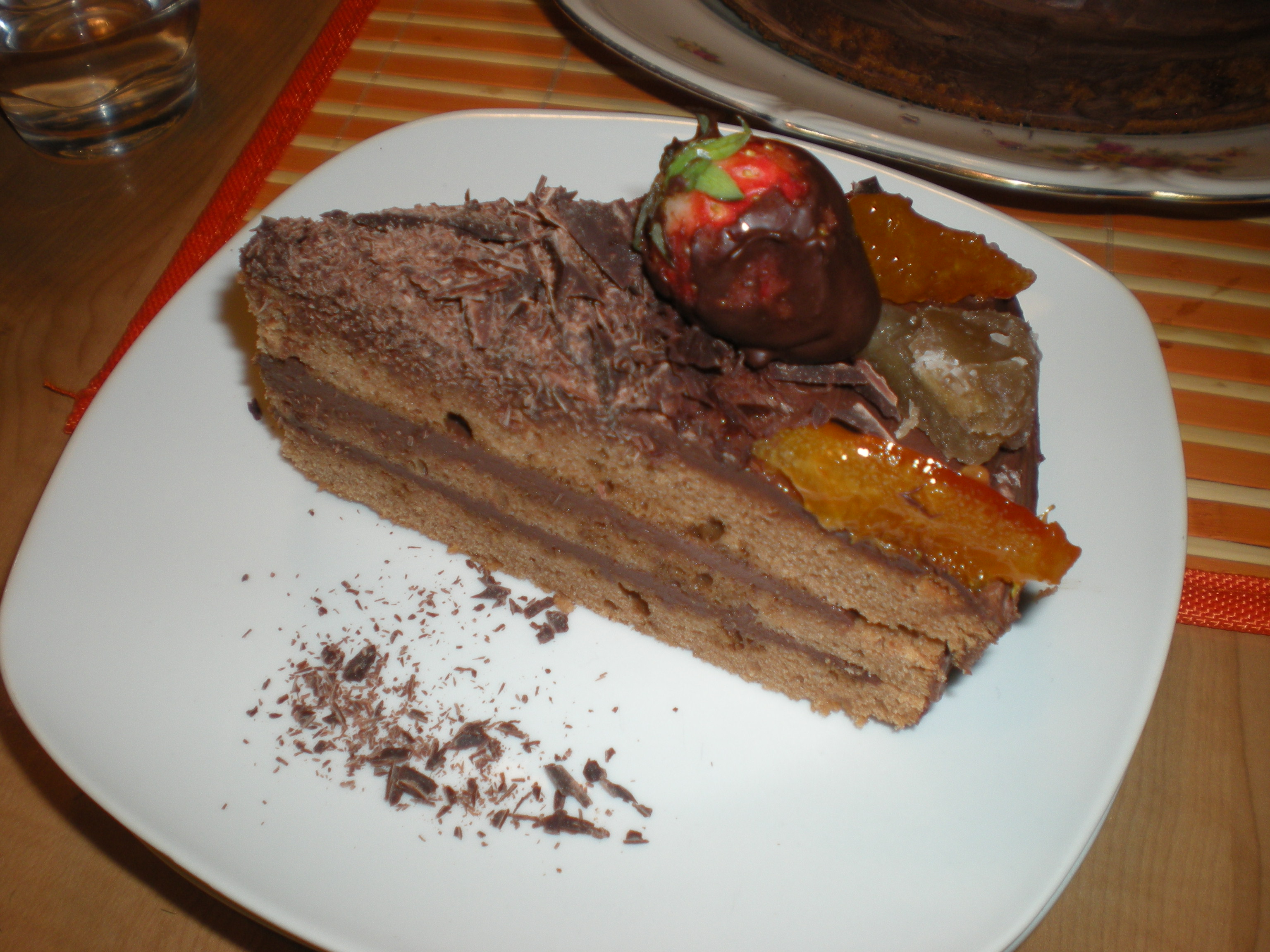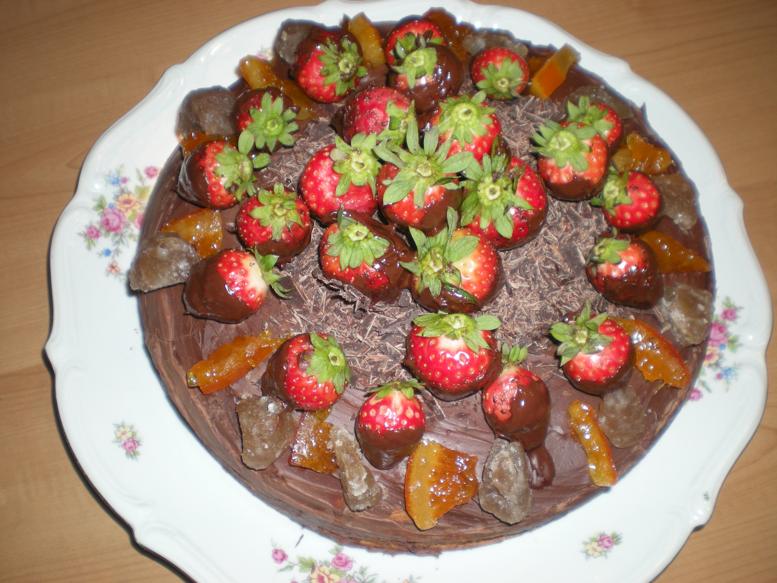 - per la torta= 250 gdi farina,250 g di burro, 250 g di zucchero,250 g di cioccolato fondente, 8 uova,1 vanillina, 1 bustina di lievito, 1 pizzico di sale.Per la crema ganasce=250 g di panna fresca, 250 g di cioccolato fondente.Per la bagna caffè espresso a piacere e rum a piacere. Per la decorazione fragole intinte per metà nel cioccolato, marrons glacè, e fettine di arance caramellate
