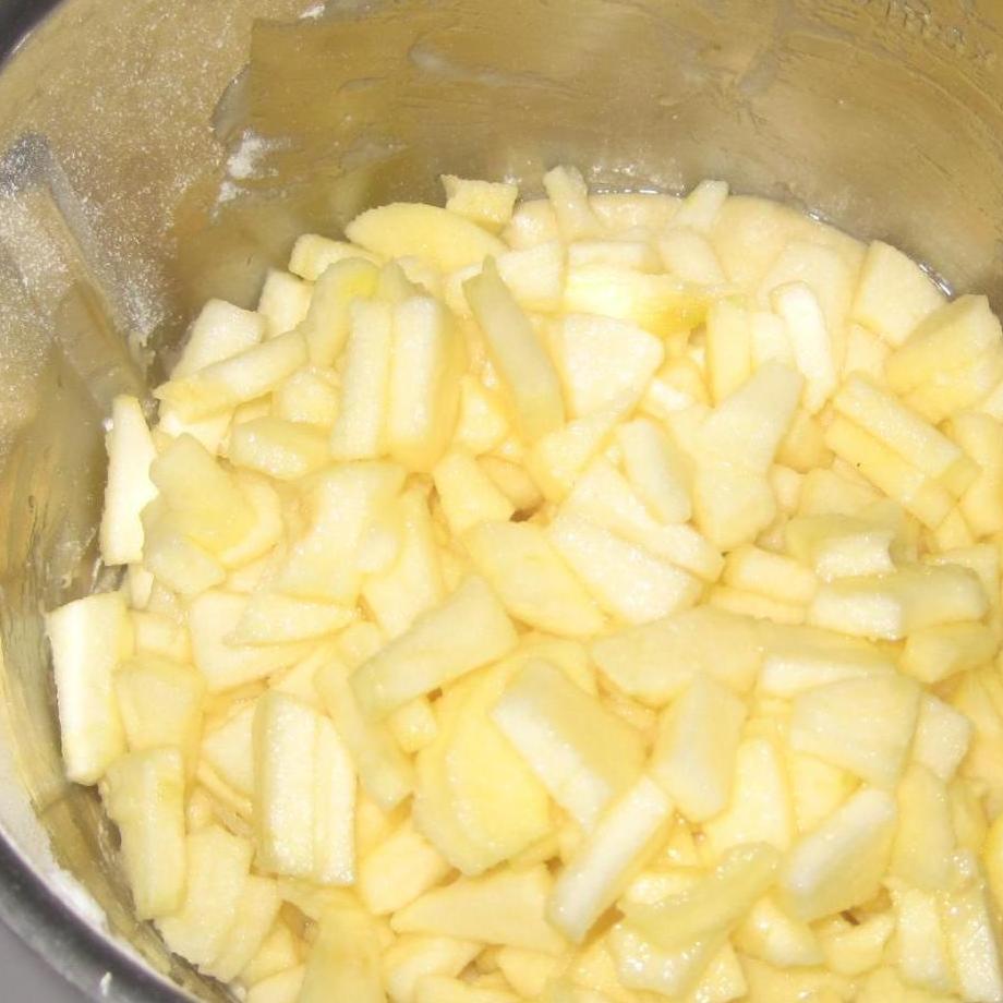"coperchio chiuso" le uova, lo zucchero, l’olio, la farina e il lievito e impastare 20 secondi / velocità 7.Aggiungere le mele con il succo di limone: 2 minuti / velocità