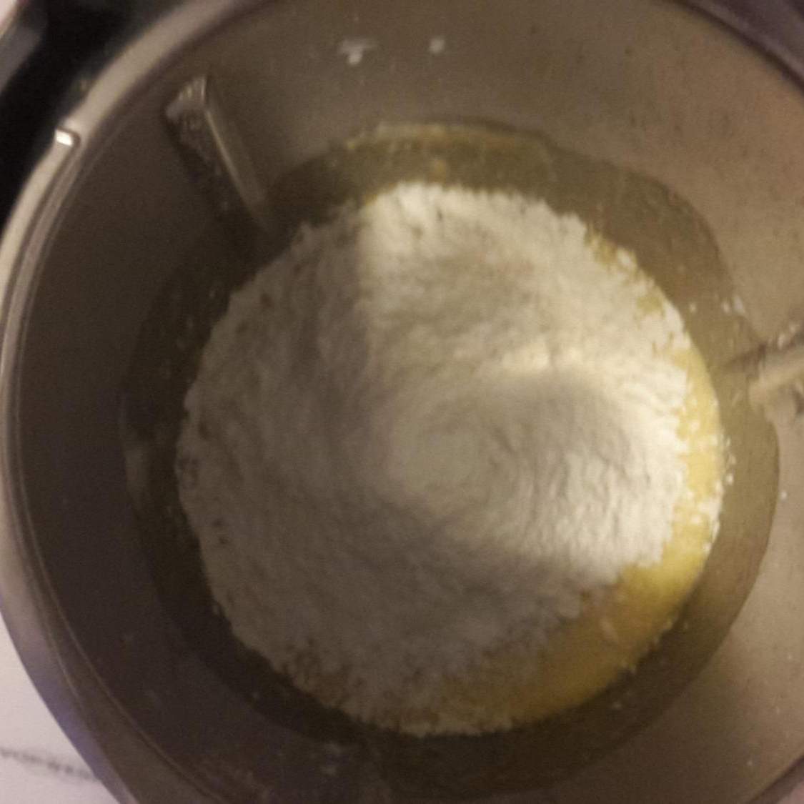 4. Aggiungere la farina e il lievito e impastare per 30 sec vel 5.