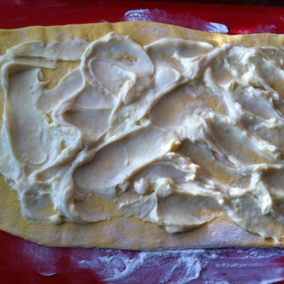 Buttare un po' di farina sulla spianatoia e stendere subito l'impasto dandogli forma rettangolare.