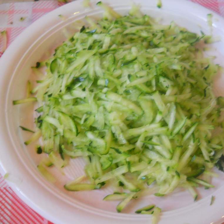 Per prima cosa lavate e tagliate le estremita' delle zucchine e grattuggiatele con una grattuggia e fatele a Julienne e una volta gratt schiacciatele un po' per fra uscire l'acqua in eccesso io ho scelto delle zucchine piccole proprio perche' contengono meno acqua Nel frattempo accendere il forno a 180°