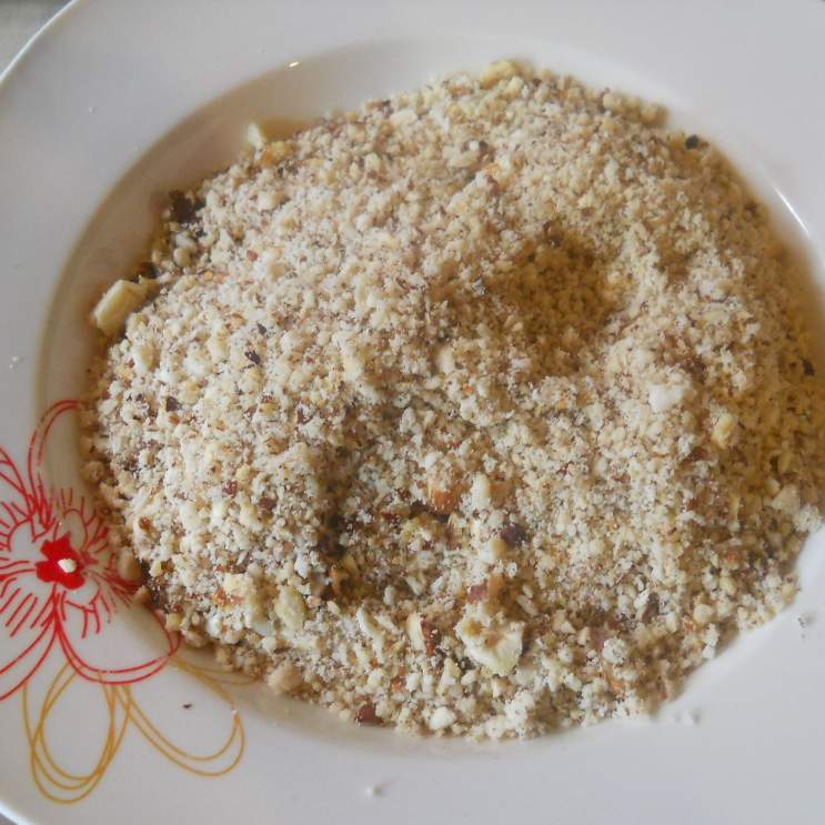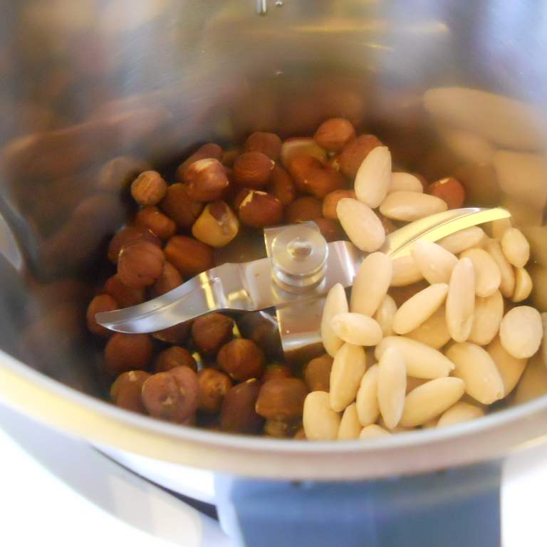 Ora mettere nel boccale le nocciole e le mandorle e tritate con qualche colpo turbo anche se alcuni pezzi rimaranno un po' grossi non fa' nulla