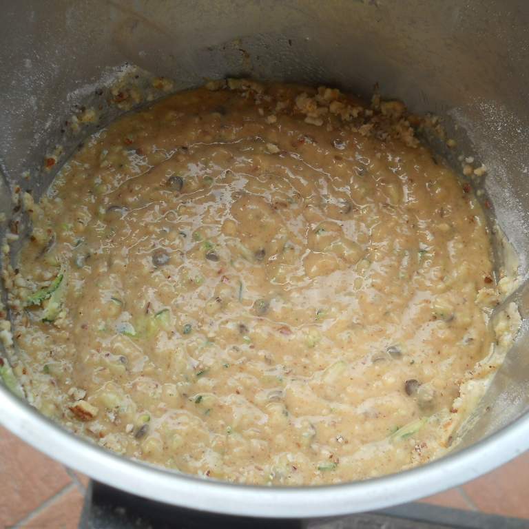 A questo punto unite la farina le nocciole e le mandorle tritrate le gocce di cioccolato fondente zucchine tritate e in fine il burro fuso che avremo fatto sciogliere sul fornello con fiamma bassa e mescolate il tutto per 50 Sec Vel 3