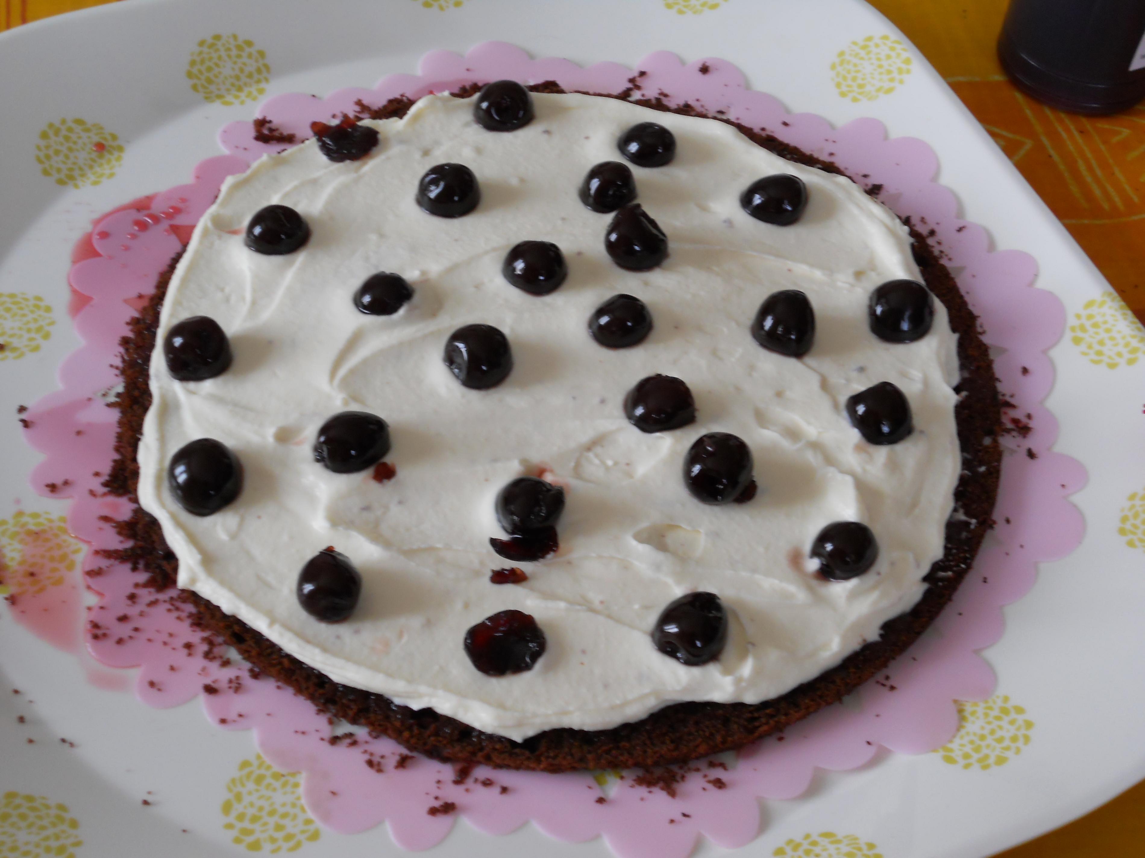 Tagliate ora la base della torta in 3 parti e, con lo sciroppo delle amarene, eventualmente aggiungendo un po' di acqua (poca) inzuppate le basi dei tre dischi ottenuti.