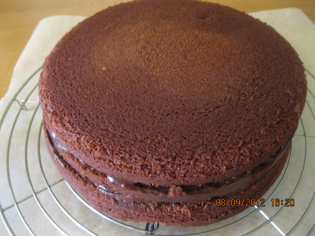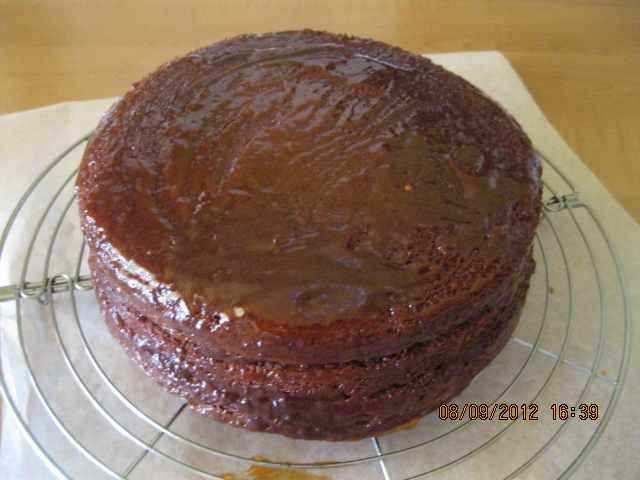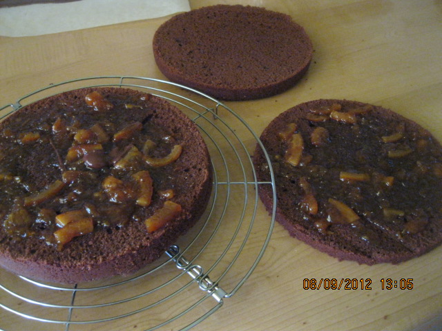 Tagliare la torta in 3 strati e stendere un velo di marmellata sui primi 2, poi la farcia tenendone da parte un po'.