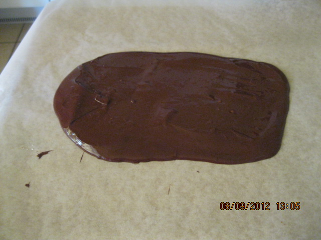 Fare sciogliere il cioccolato e stenderlo su carta da forno, quando è freddo tagliare dei triangoli e posizionarli sulla torta.