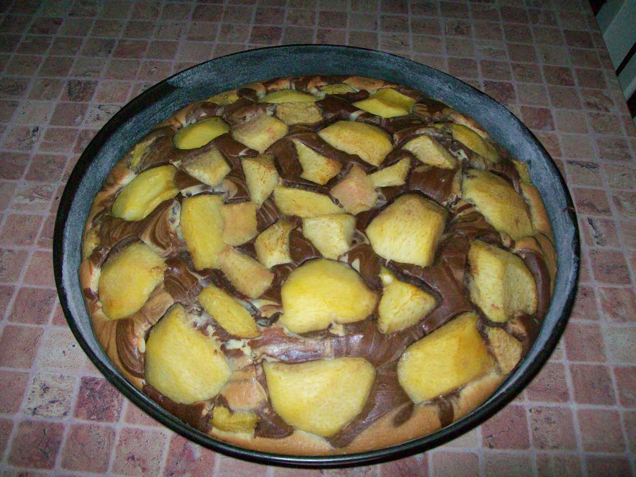 "coperchio chiuso" , meno che il cacao e le pesche: 25-30sec / vel 5. Togliere la metà dell'impasto, aggiungere il cacao: 10sec / vel 5. Mettere l'impasto bianco nella teglia, sopra , quello al cacao, girare il tutto delicatamente con la forchetta. Sistemarvi la frutta, facendo una leggera pressione. Infornare: forno caldo: 175° / 30-40min. Decorare con lo zucchero a velo.