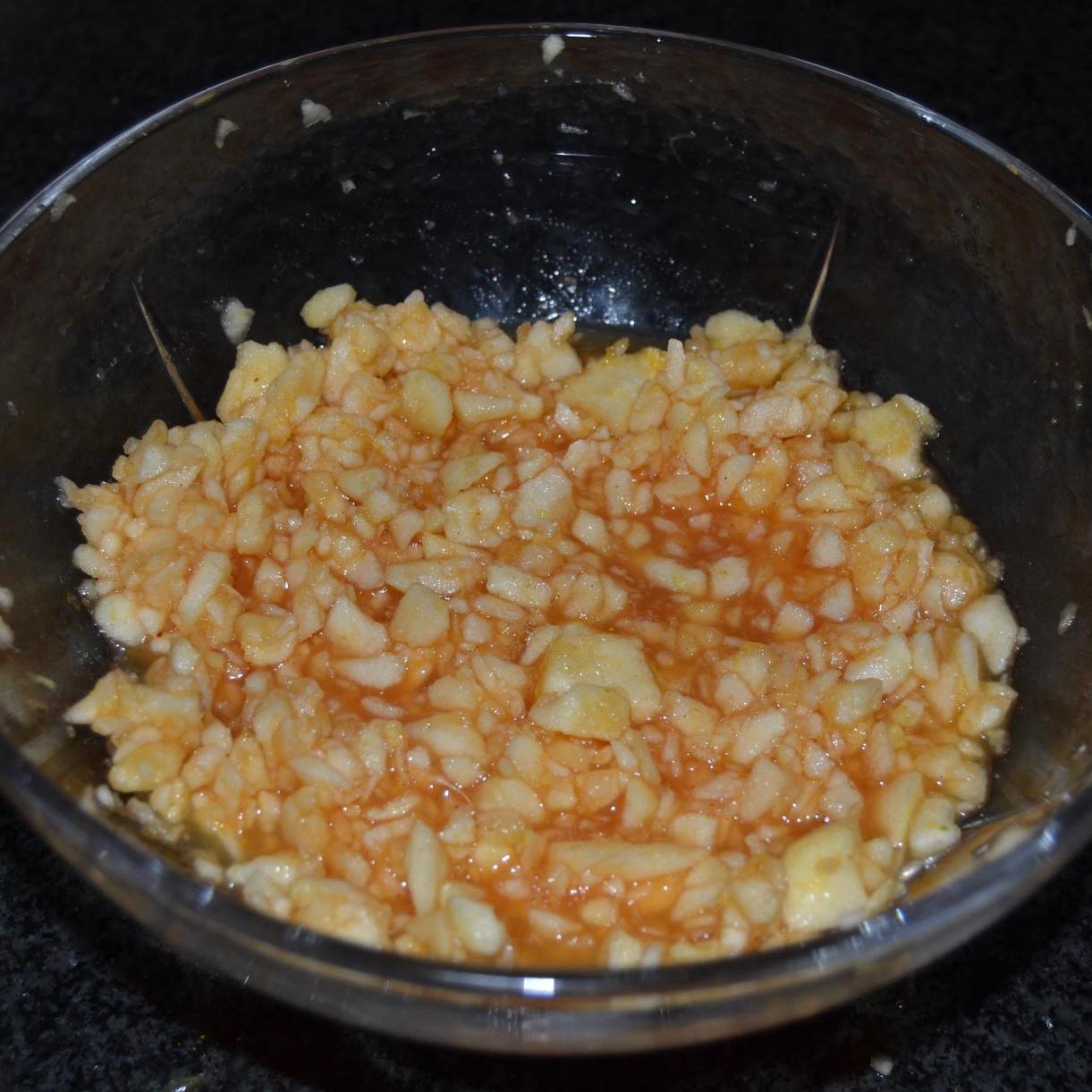 Pesare lo zucchero e metterlo da parte. Inserire nel boccale le mele sbucciate e private dei torsoli. Tritarle grossolanamente 3 sec. vel. 3.