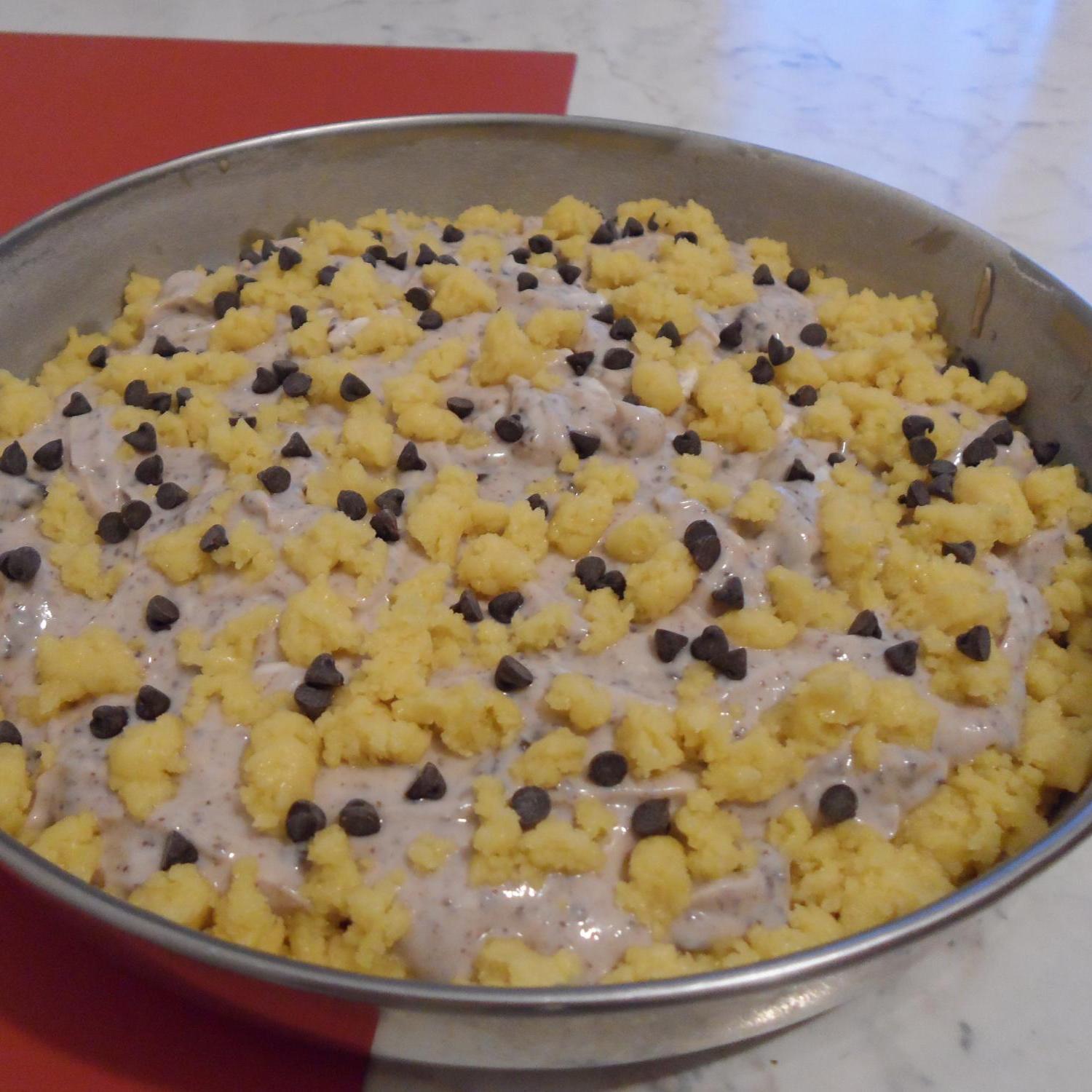 "coperchio chiuso" pulito tritare il cioccolato: 3 sec. vel.4, unire zucchero e ricotta: 10 sec. vel.4.Sbricciolare la frolla in tutta la teglia lasciandone da parte circa un etto. Versare sopra la crema di ricotta e cioccolato e continuare a sbricciolare l'ultimo etto di frolla e cospargere di gocce di cioccolato.