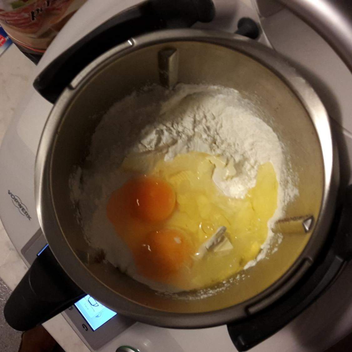 3. Aggiungere lo zucchero, la farina, il burro e le uova e tritare per 40 sec vel 6.