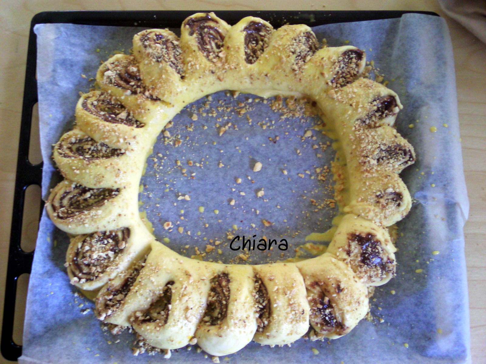 Spennellare con un tuorlo diluito con tin po' di latte e cospargere di granella di nocciole.