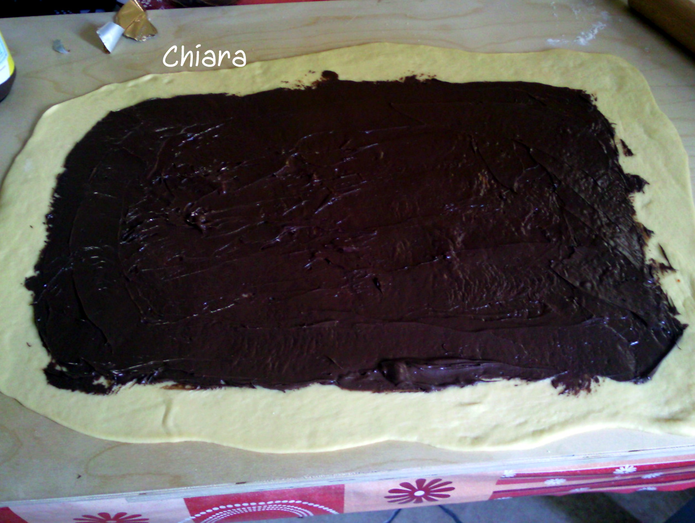 Ricoprire con la crema gianduia lascaindo un paio di centimetri lungo il lato più lungo e molto meno lungo il lato corto e avvolgere a rotolo.