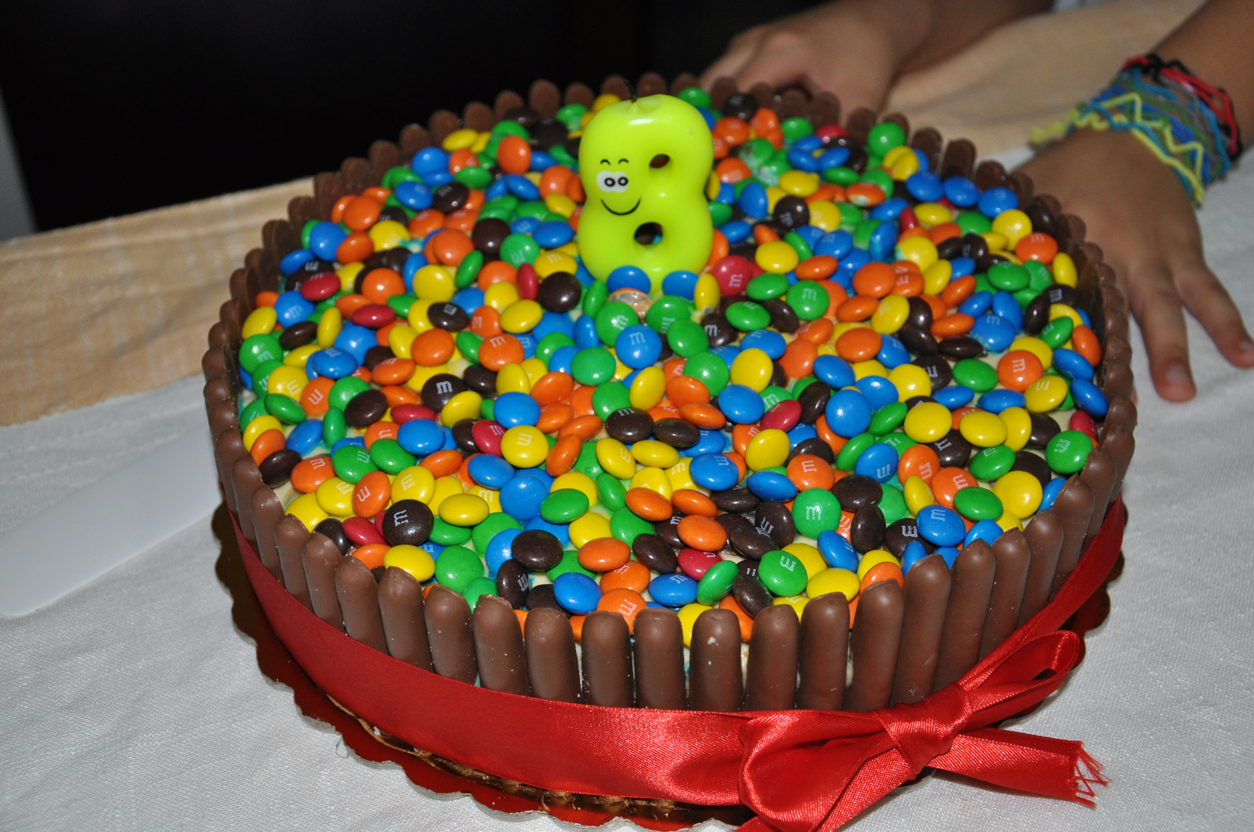 Per completare, con l’aiuto di una spatola per dolci o con lo stesso coltello utilizzato per tagliare il pan di spagna, rivestiamo la torta con la restante crema al tiramisù livellando con cura i bordi e la superficie. Attacchiamo i togo uno accanto all’altro sui bordi, e svuotiamo le buste di m&ms sulla superferice della torta cercando di fare attenzione a rivestire completamente senza lasciare buchi.