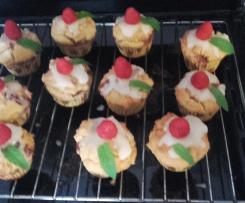 Aggiungere l'acqua calda e lavorare 5 Sec. Vel. 4. - Mettere le tortine a raffreddare sulla gratella del forno, spennellare con la glassa e appoggiare i lamponi e le foglie di menta.