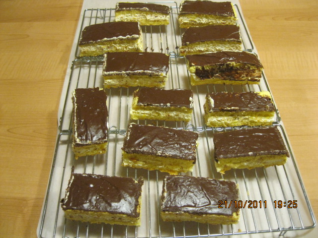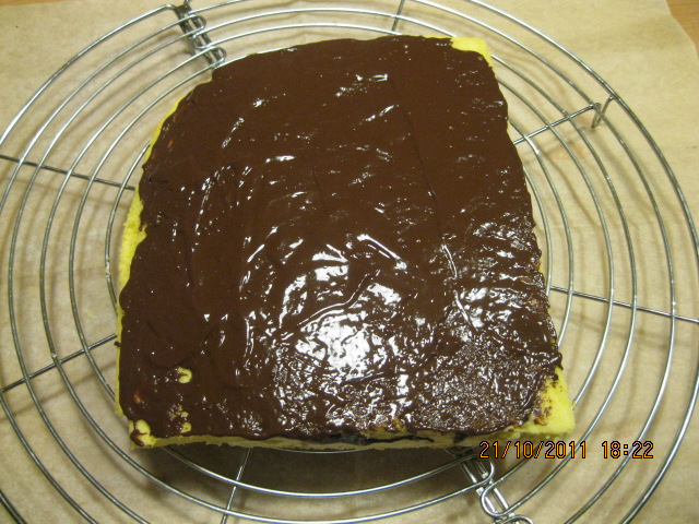 "coperchio chiuso" e scaldare per 5m a 80° vel 1 , poi aggiungere il cioccolato precedentemente tritato per pochi sec. vel 3 , fare raffreddare, poi spalmare su tutto il dolce con uno strato sottile e tagliare il 16 pezzi.Fondere il cioccolato nel