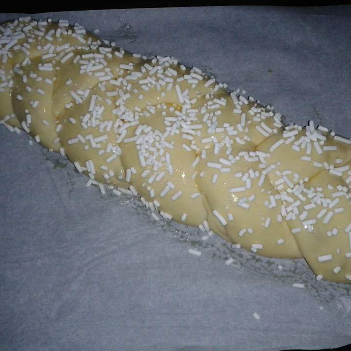 5) Accendere il forno a 180°. - 6) Prendere la treccia , spennellarla con il mezzo uovo sbattuto e cospargere con granella di zucchero, infornare e cuocere per circa 20 min in forno statico.