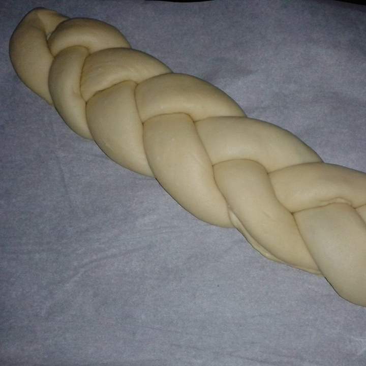 4) Rivestire la placca del forno con cartaforno e adagiarvi la treccia, coprire bene e lasciare lievitare finchè il volume non sarà raddoppiato, circa 2 ore.