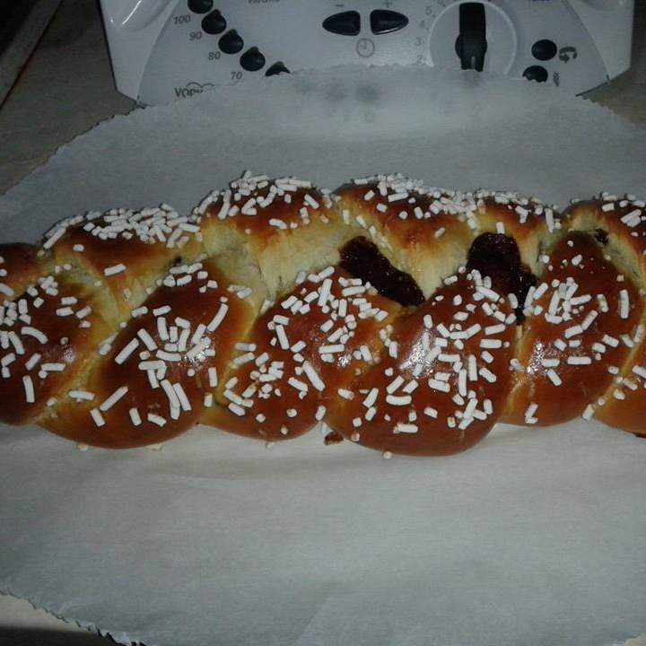 "coperchio chiuso" e stenderlo col mattarello formando un rettangolo che dividerete in 3 strisce; su ognuna distribuire la crema gianduia Bimby lasciando liberi i bordi. Chiudere bene ogni striscia farcita e formare una treccia.