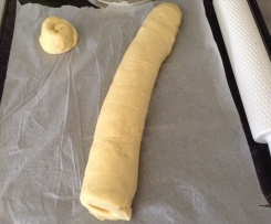 4. Arrotolare dal lato più lungo e tagliare dall'estremità, una fetta di 3 cm di spessore circa, che servirà a chiudere la nostra treccia.