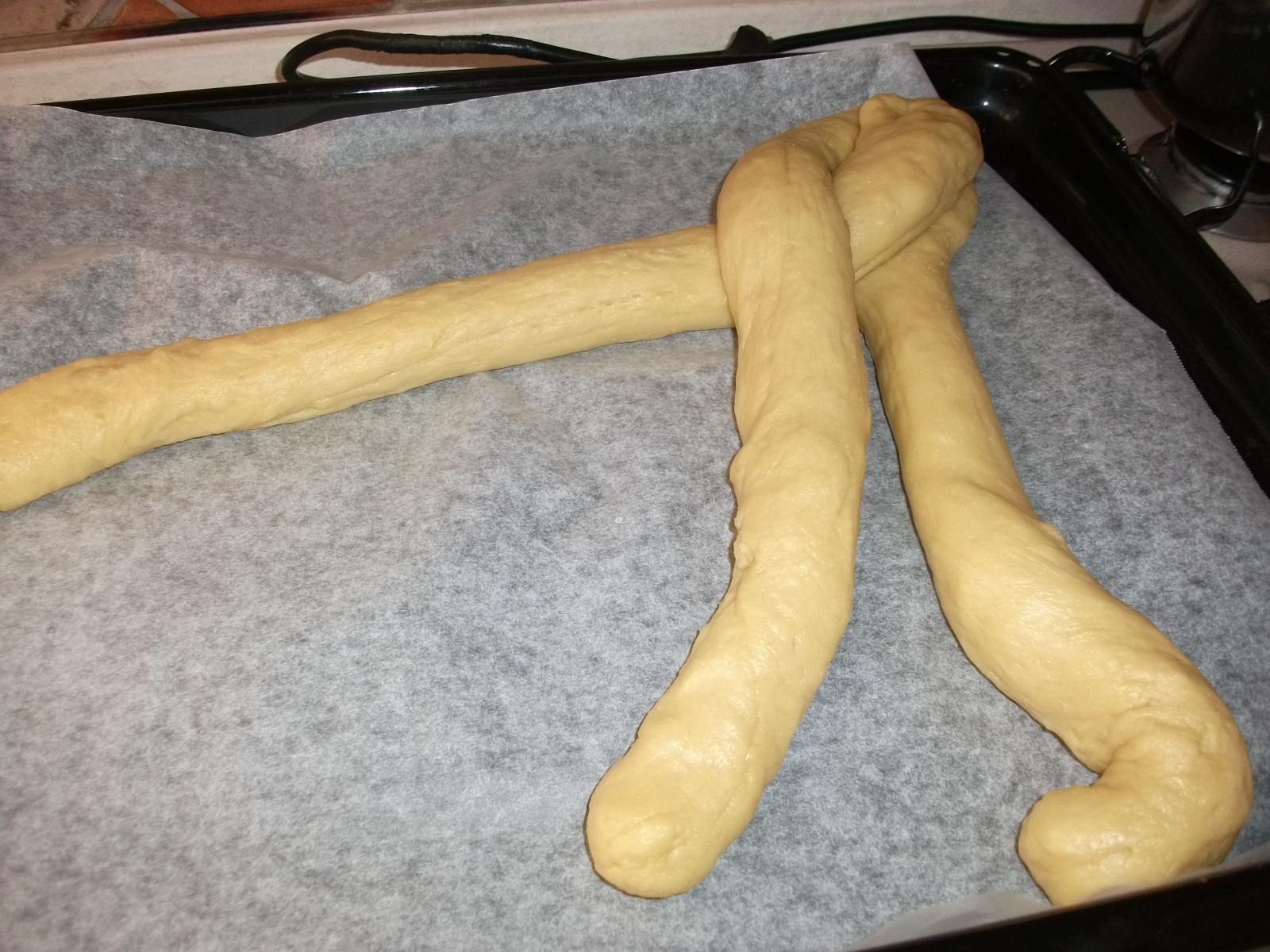 Dividere l'impasto in 3 parti e fare tre serpentoni che poi bisognerà intrecciare.. ( volendo si possono farcire i serpentoni prima di chiuderli, con nutella, marmellata o gocce di cioccolato