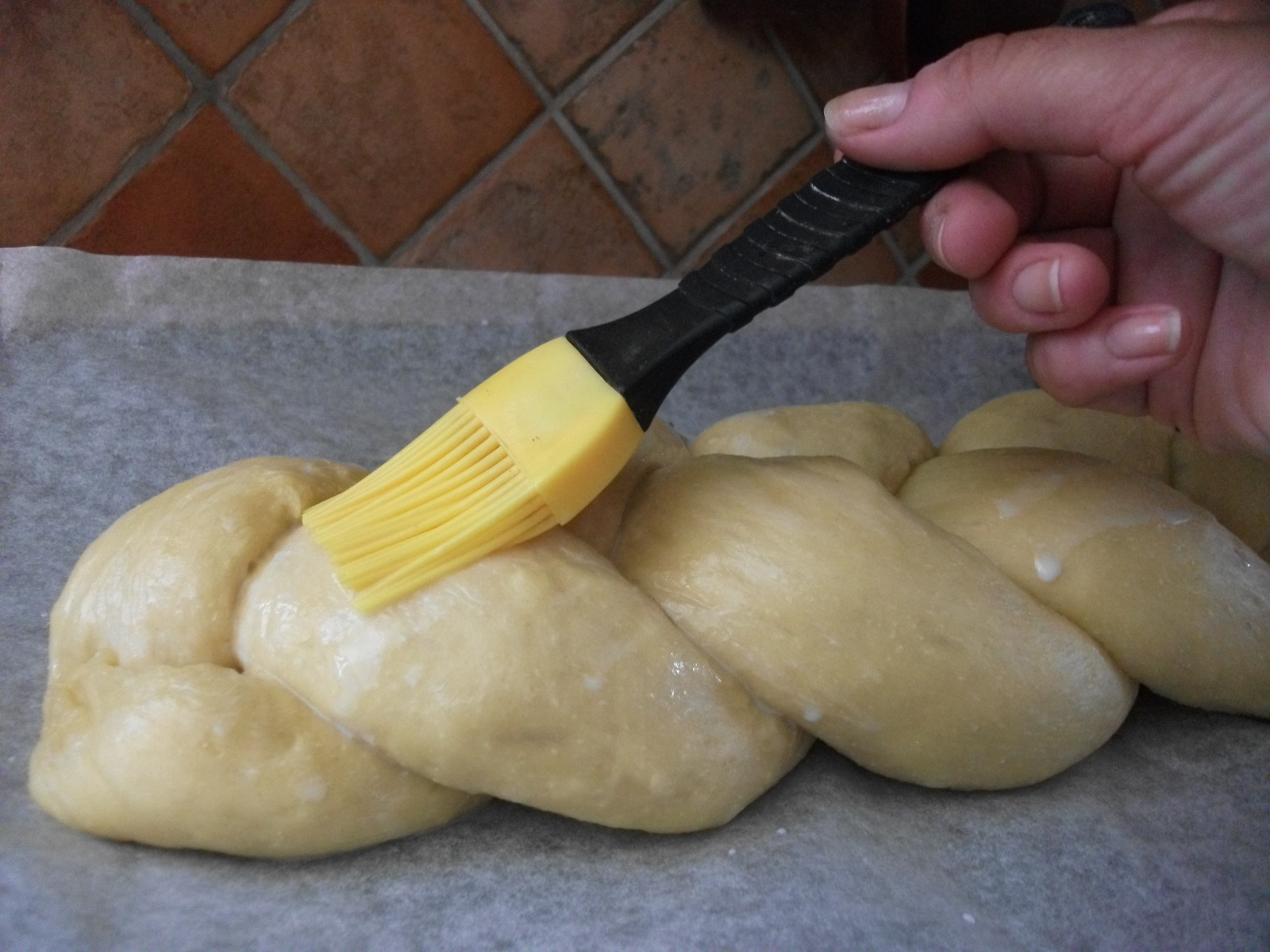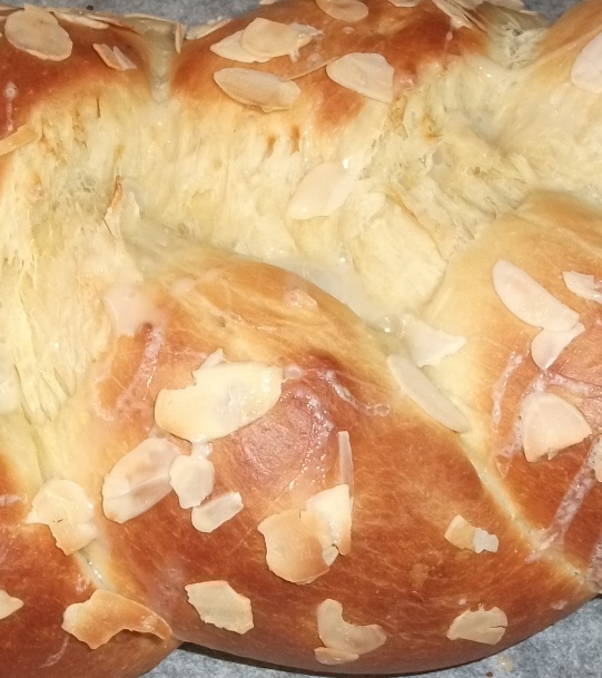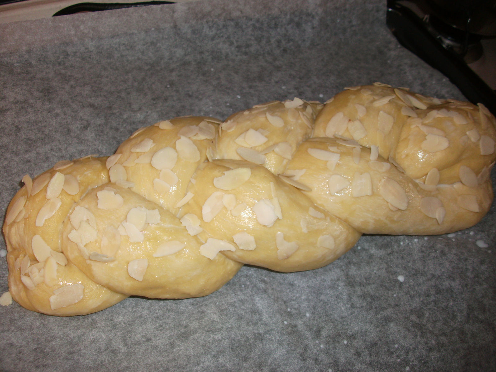 Appoggiare la treccia sulla placca del forno coperta di carta da forno e far lievitare per un'altra mezz'ora.Poi spennellare con latte, cospargere con le lamelle di mandorla ( o granella di zucchero) e infornare a 180° ventilato per 20 minuti avendo l'accortezza di mettere in forno un recipiente con dell'acqua.