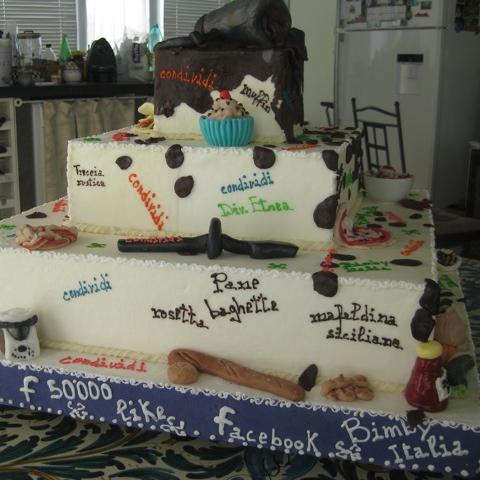 Per la pasta di zucchero potete usare la ricetta che si trova nel libro "Torte e biscotti 2". Sono stati utilizzati coloranti alimentari per tutte le figure che compongono la torta, è stata usata glassa di zucchero colorata con colori alimentari e cioccolato fondente fuso per le varie scritte.