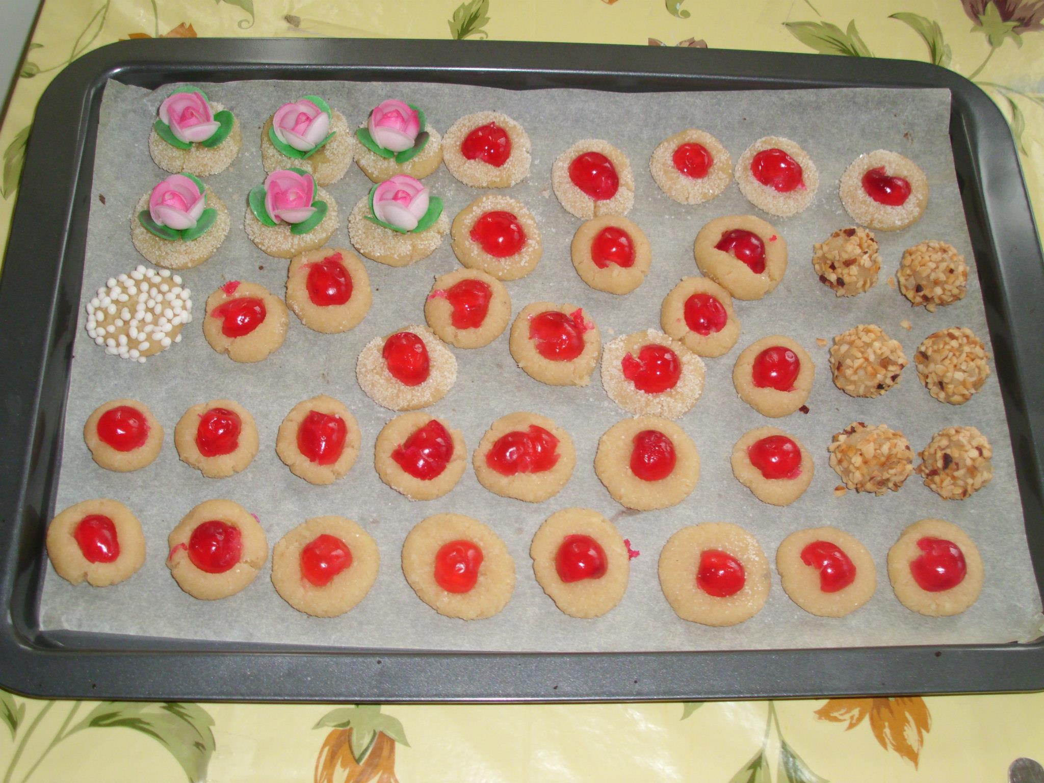Su una teglia foderata con carta.forrno ) fai delle palline su cui a piacere potrai mettere o una ciliegina candita o una mandorla pelata,oppure passarle nella granella di mandorla.ecc. Infornare a forno statico preriscaldato a 150° per10 minuti.