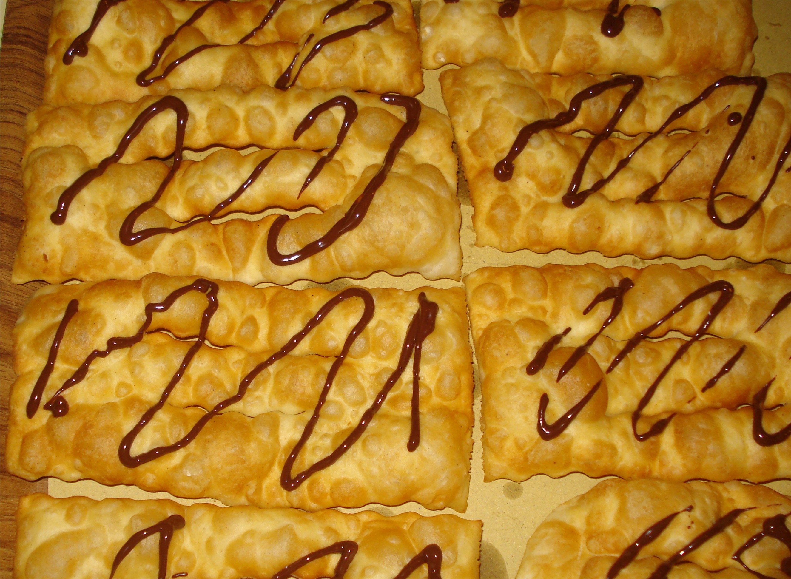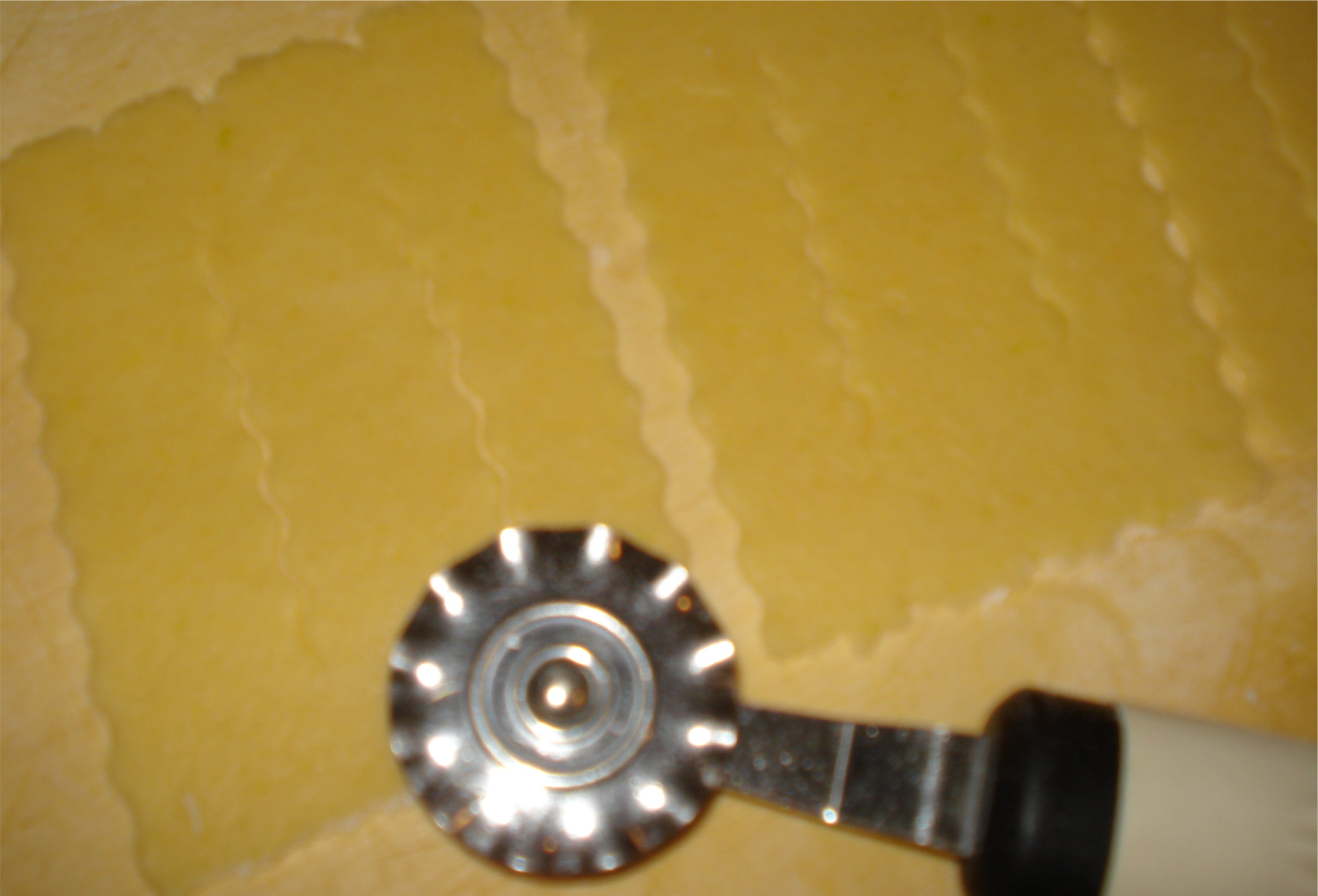 "velocità spiga" .Tirare subito dei pezzi, piegarli due o tre volte e dare una regolare forma rettangolare. Tenere i pezzi ben coperti in modo che non facciano la crosta, poi cominciare a tirare la sfoglia abbastanza sottile, tagliare dei rettangoli o quadrati di 10 cm circa di lato usando una rotella dentellata. Nel centro praticare due tagli.