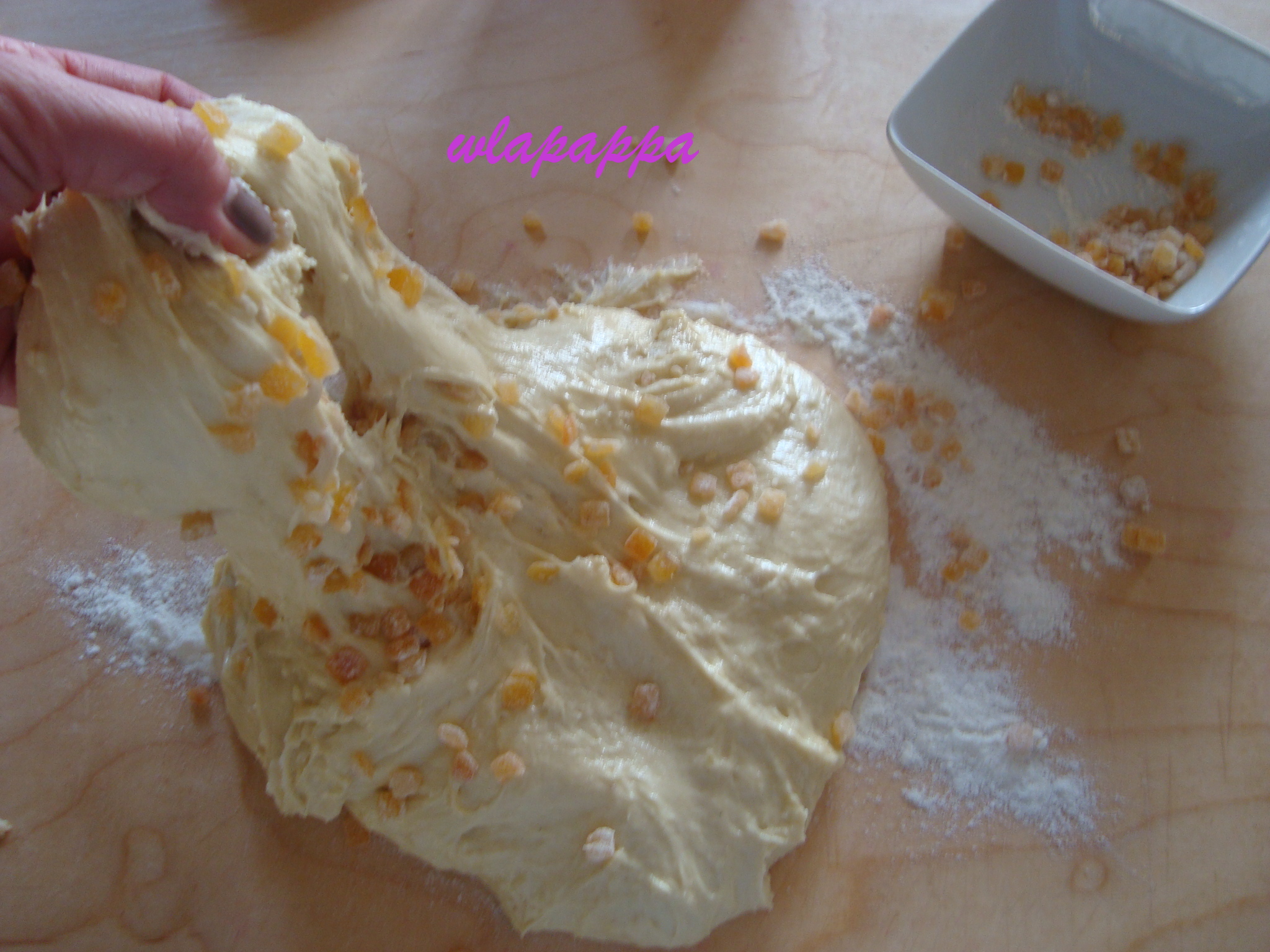 Dividere l'impasto in 2 e adagiarlo su di un piano di lavoro, aiutarsi con pochissima farina. L'impasto sarà un po' appiccicaticcio ma molto elastico (come da foto). Unire le arance candite.